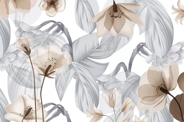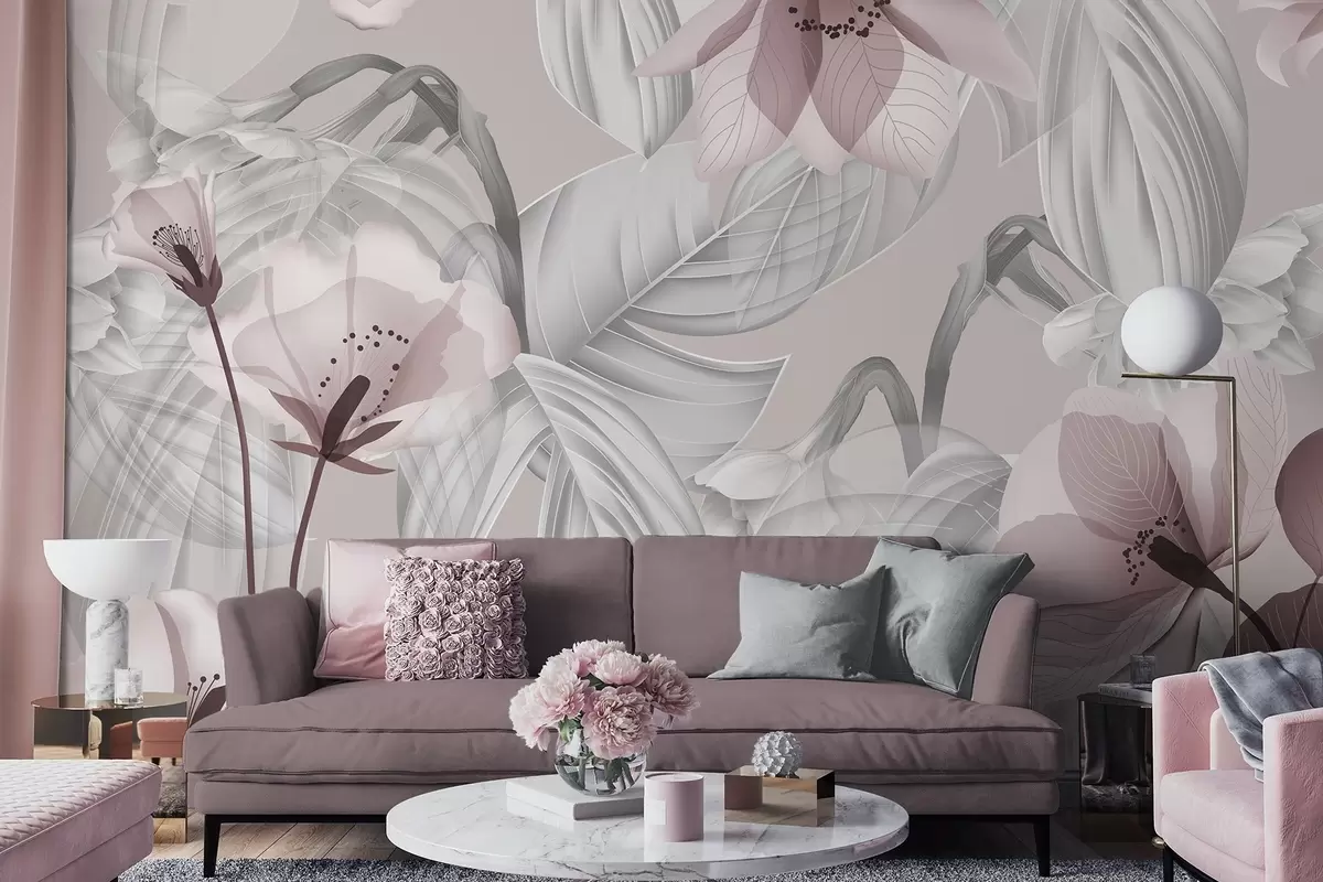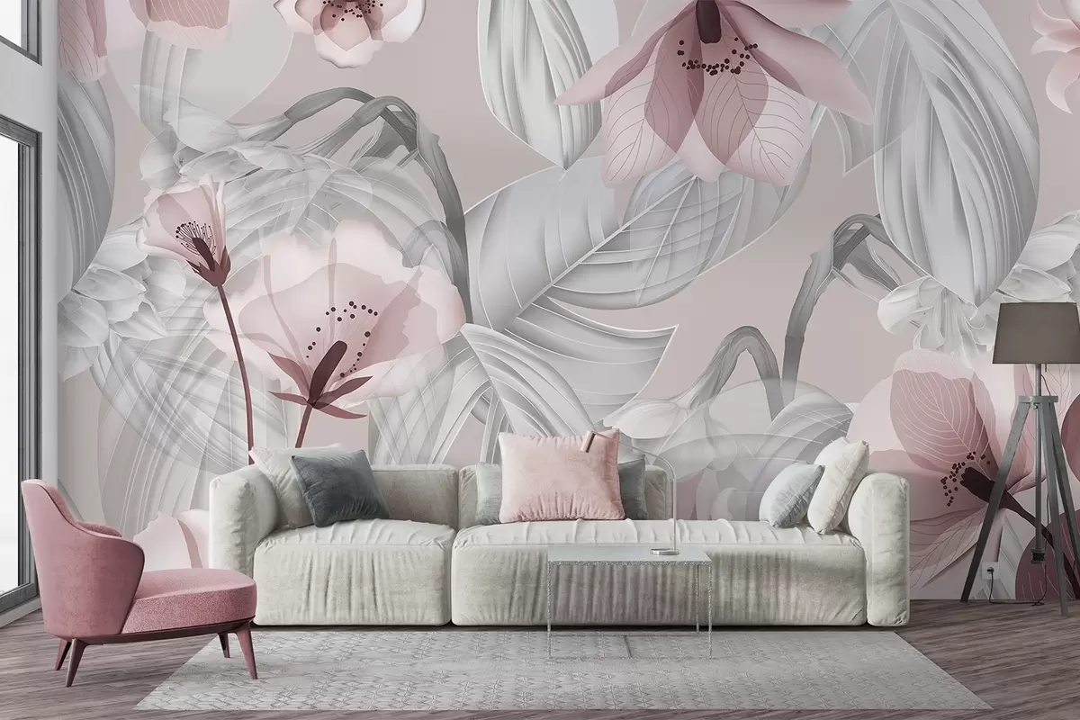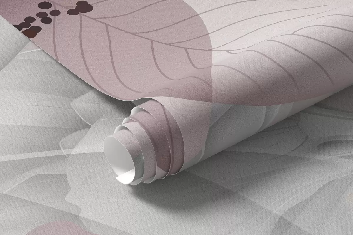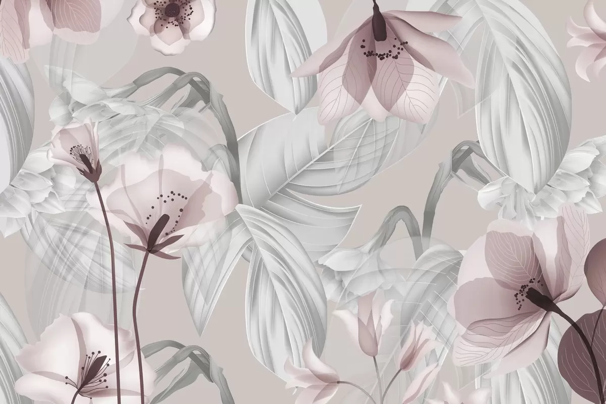 Fototapetak Rózsaszín virágok és szürke levelek, virágos botanikai háttér, elegáns dizájn, lágy színek, finom részletek Nr. w09497