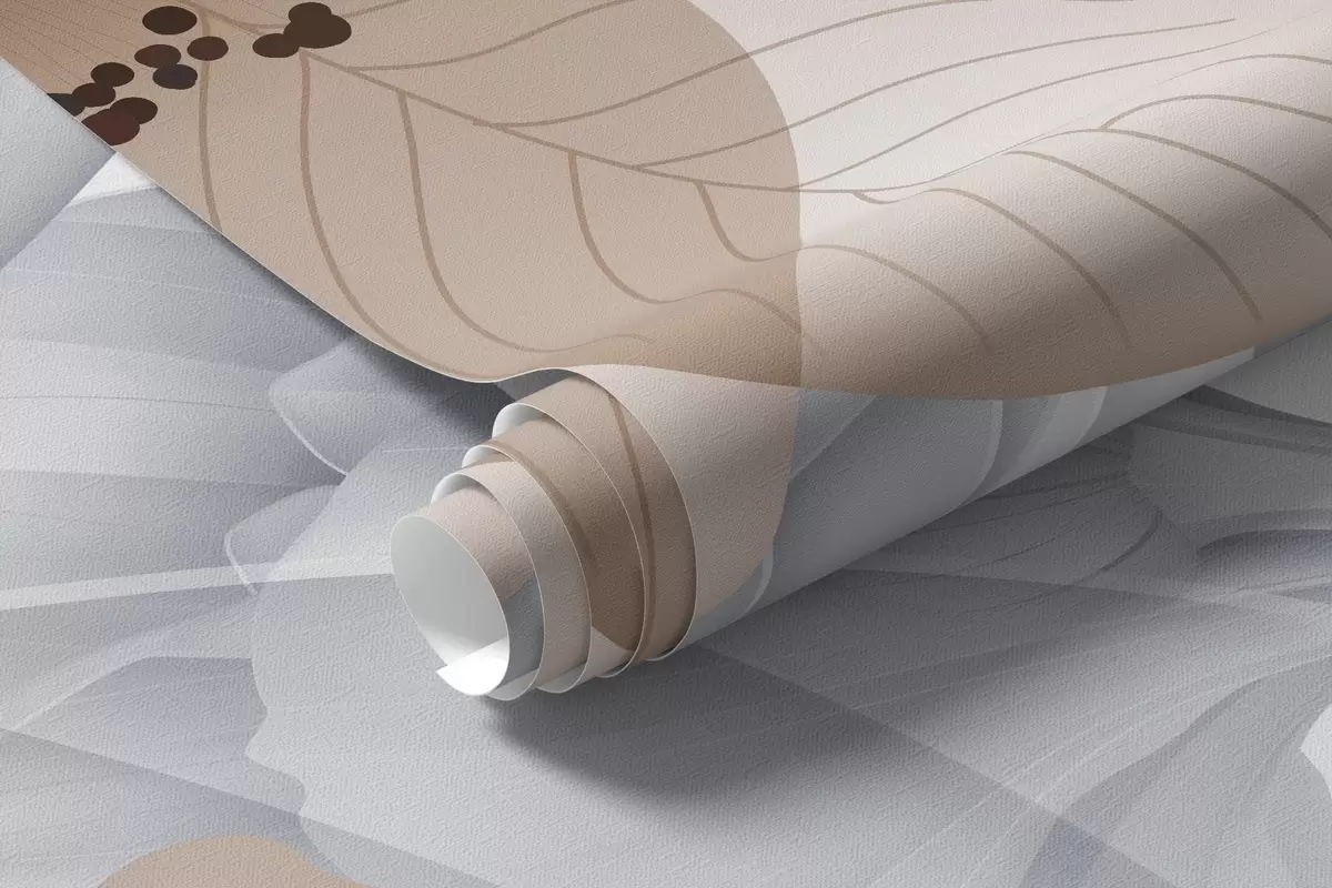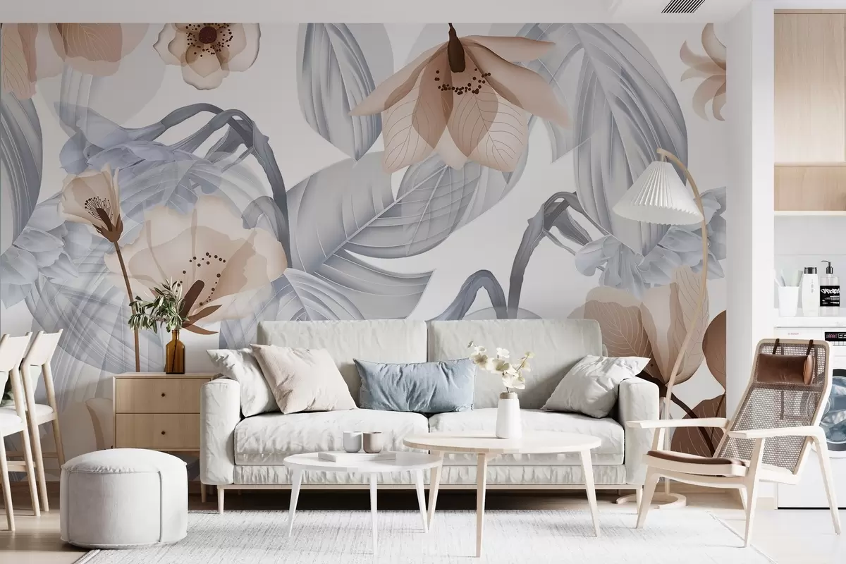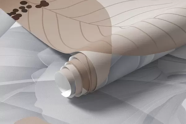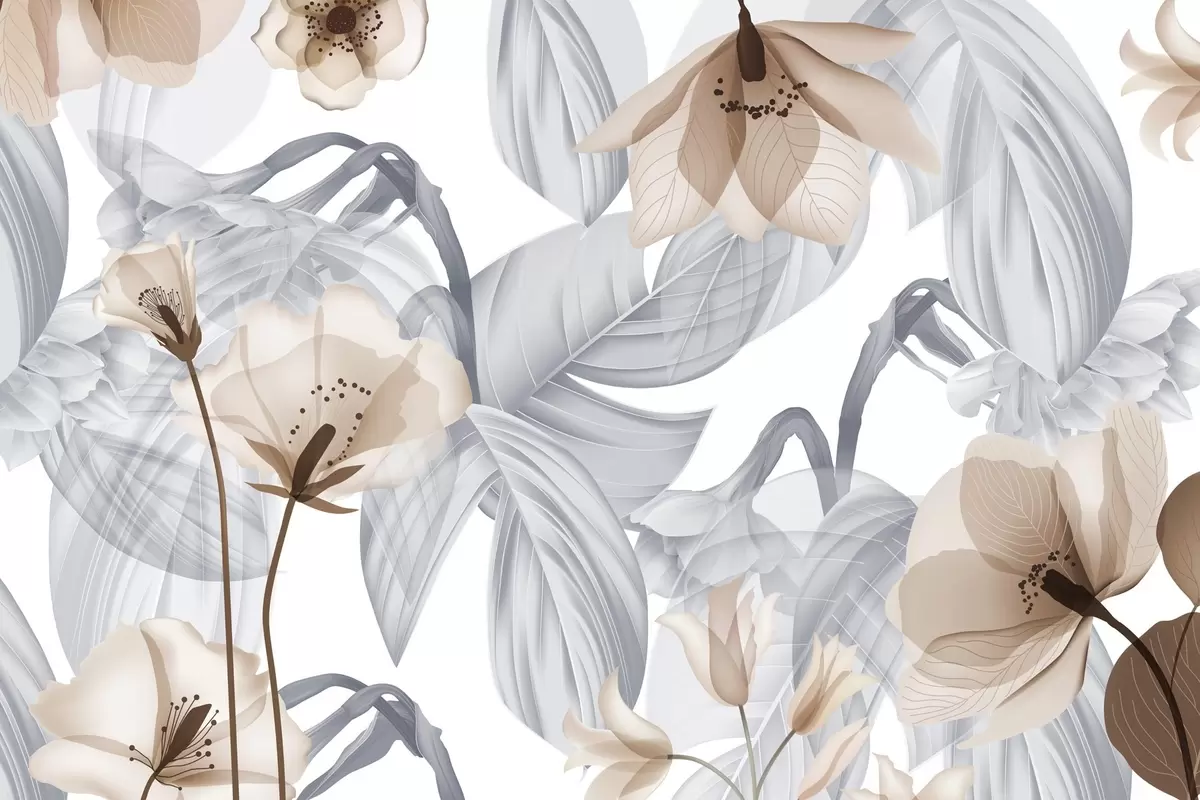 Fototapetak Barna virágok és szürke levelek, virágos botanikai háttér, elegáns dizájn, lágy színek, finom részletek Nr. w09497v1