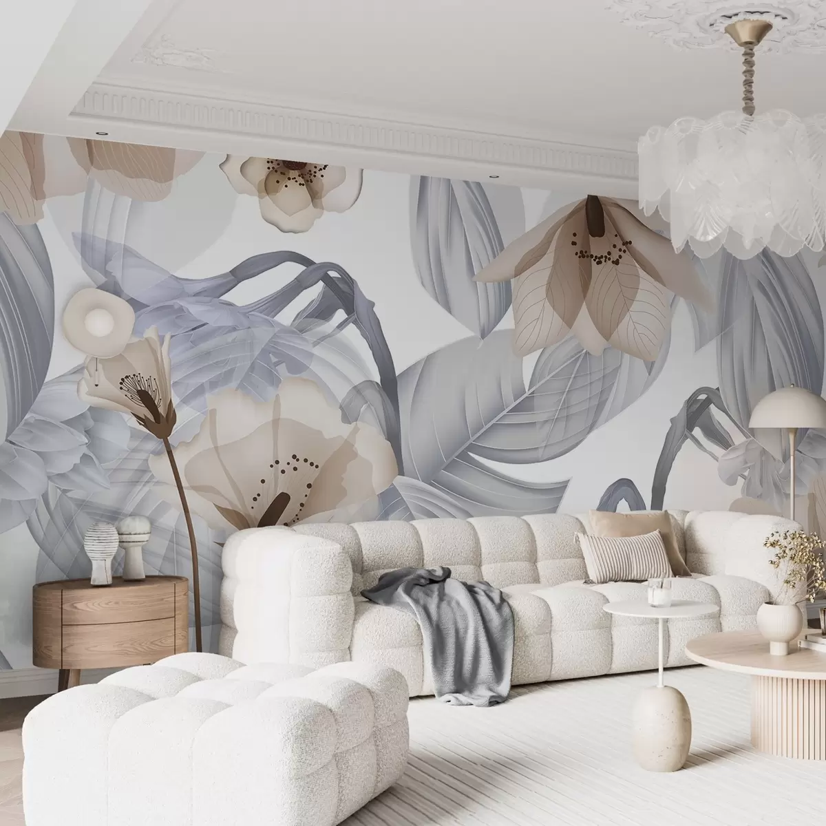 Fototapetak Barna virágok és szürke levelek, virágos botanikai háttér, elegáns dizájn, lágy színek, finom részletek Nr. w09497v1