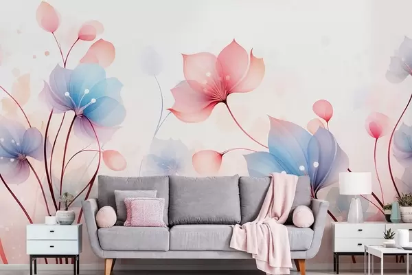 Fototapetak Finom rózsaszín-kék virágok — légies növényvilág fehér akvarell háttér előtt Nr. w09507