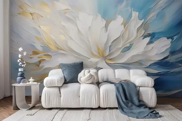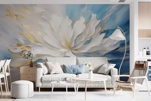 Fototapetak Kék-sárga háttér előtt nagy fehér pünkösdi rózsa olajfestmény stílusban Nr. w09511