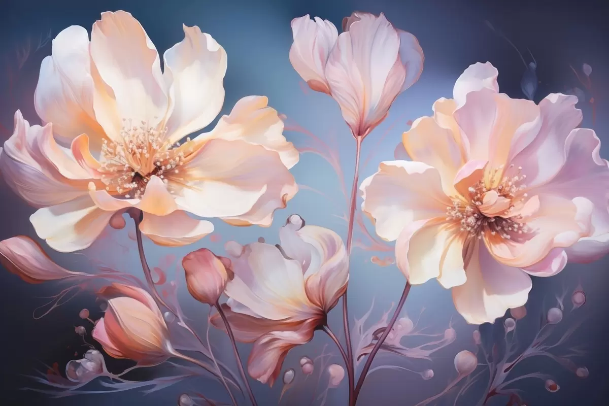 Fototapetak Légies rózsaszín-krém színű pünkösdi rózsák akvarell stílusban mélykék háttér előtt Nr. w09513
