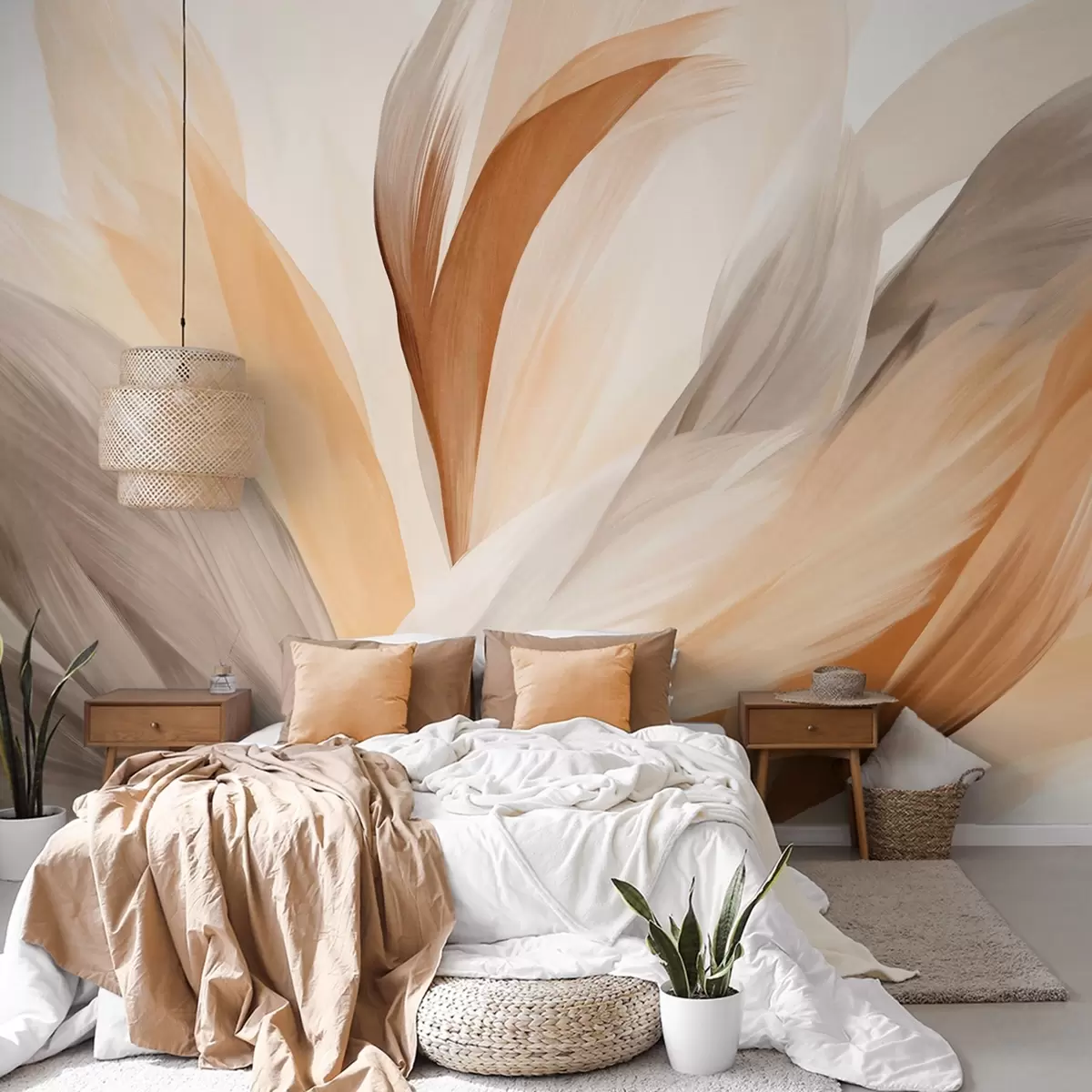 Fototapetak Absztrakt textúrájú tollak barna, fehér és szürke színben, valamint különböző árnyalatokban, fehér háttérrel átfedve egymást. Nr. w09531