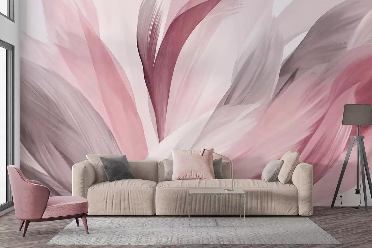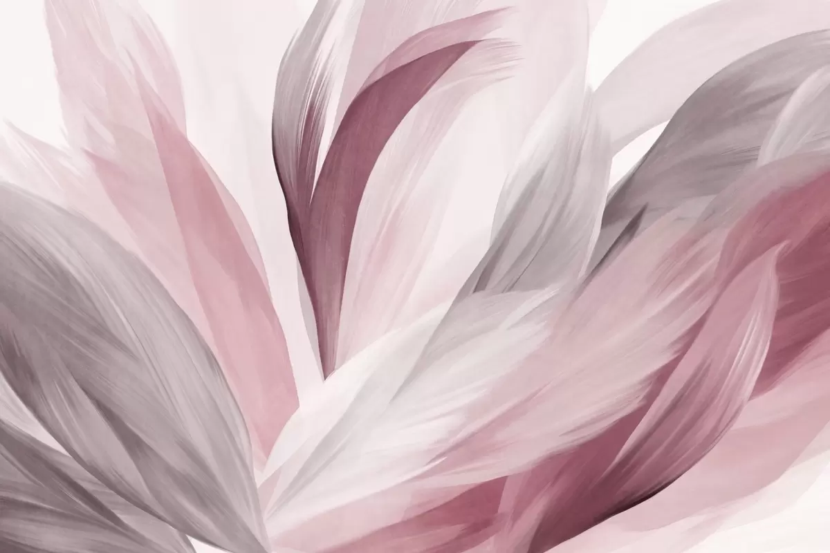 Fototapetak Absztrakt textúrájú tollak rózsaszín, fehér és szürke színben, valamint különböző árnyalatokban, fehér háttérrel átfedve egymást. Nr. w09531v2