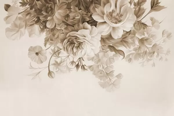 Fototapetak Vintage virágkompozíció rózsákkal, pünkösdi rózsákkal és más texturált virágokkal, levelekkel, világos háttér előtt Nr. w09532