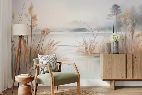 Fototapetak Tájkép tóval és magas fűvel az előtérben, hegyekkel a háttérben, lágy színekkel, textúrával Nr. w09534