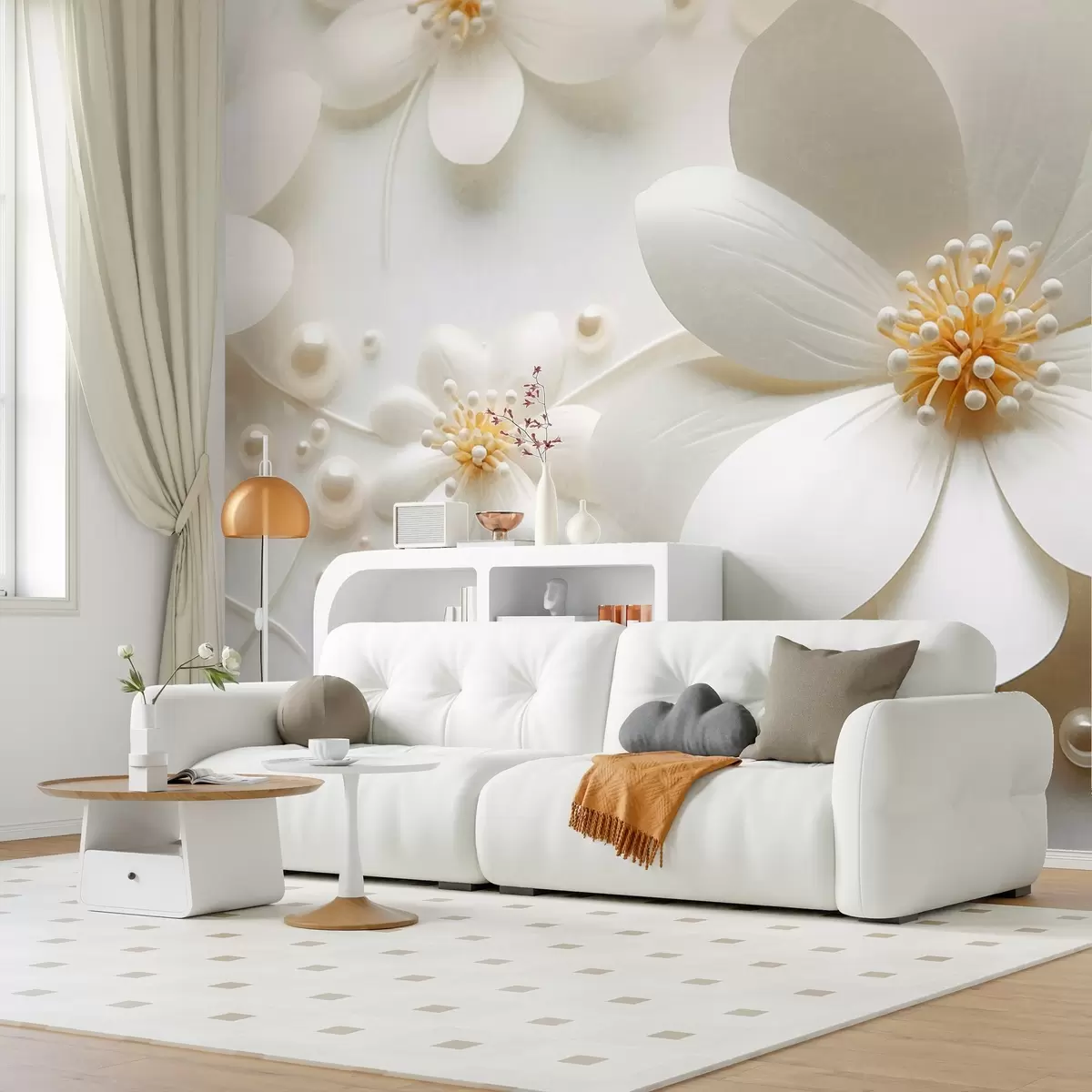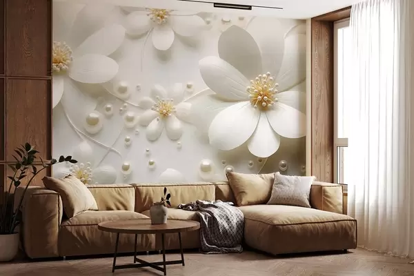 Fototapetak Fehér virágok gyöngyökkel fehér háttérrel, elegáns és minimalista dizájn, texturált Nr. w09535