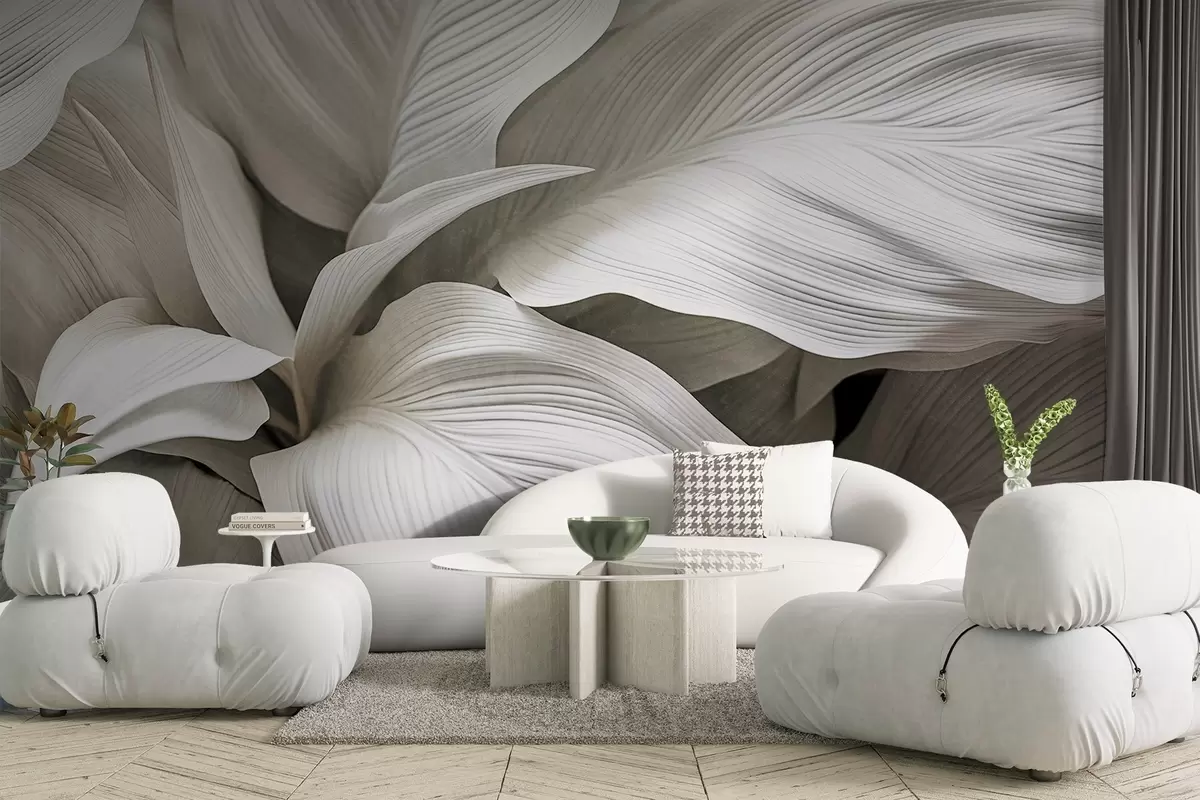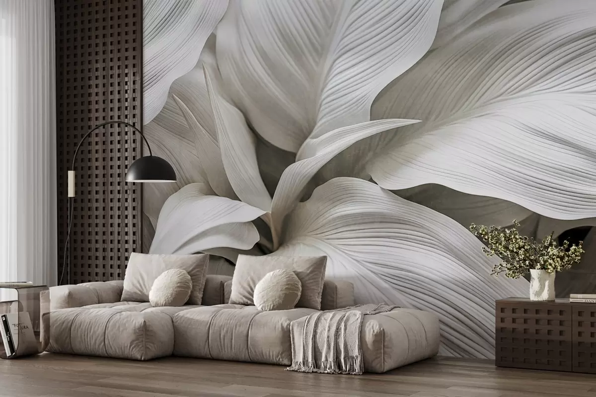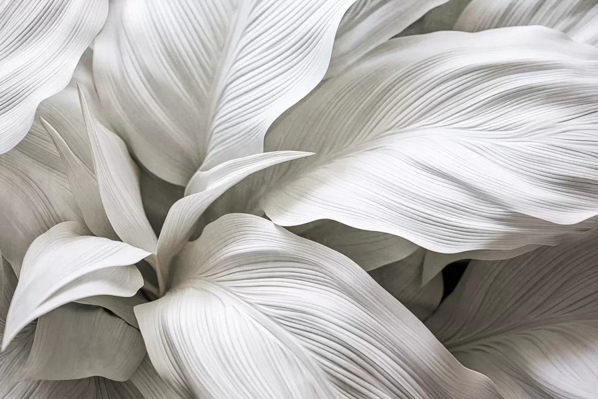 Fototapetak Nagy, texturált fehér levelek, kiemelkedő erekkel, egymást átfedve és mélységet teremtve Nr. w09536