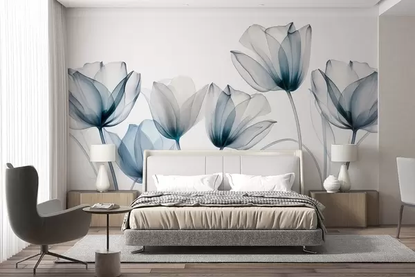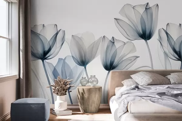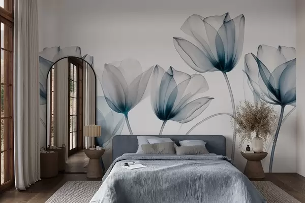 Fototapetak Átlátszó kék és fehér tulipánvirágok hosszú szárakkal, világos háttér előtt, finom és texturált virágművészet Nr. w09538