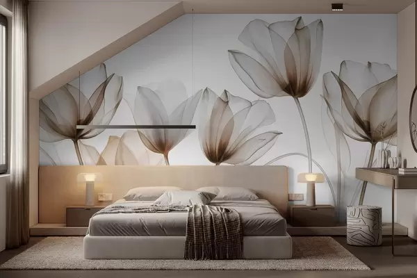 Fototapetak Átlátszó barna és fehér tulipánvirágok hosszú szárakkal, világos háttér előtt, finom és texturált virágművészet Nr. w09538v1