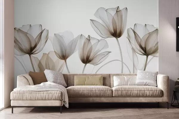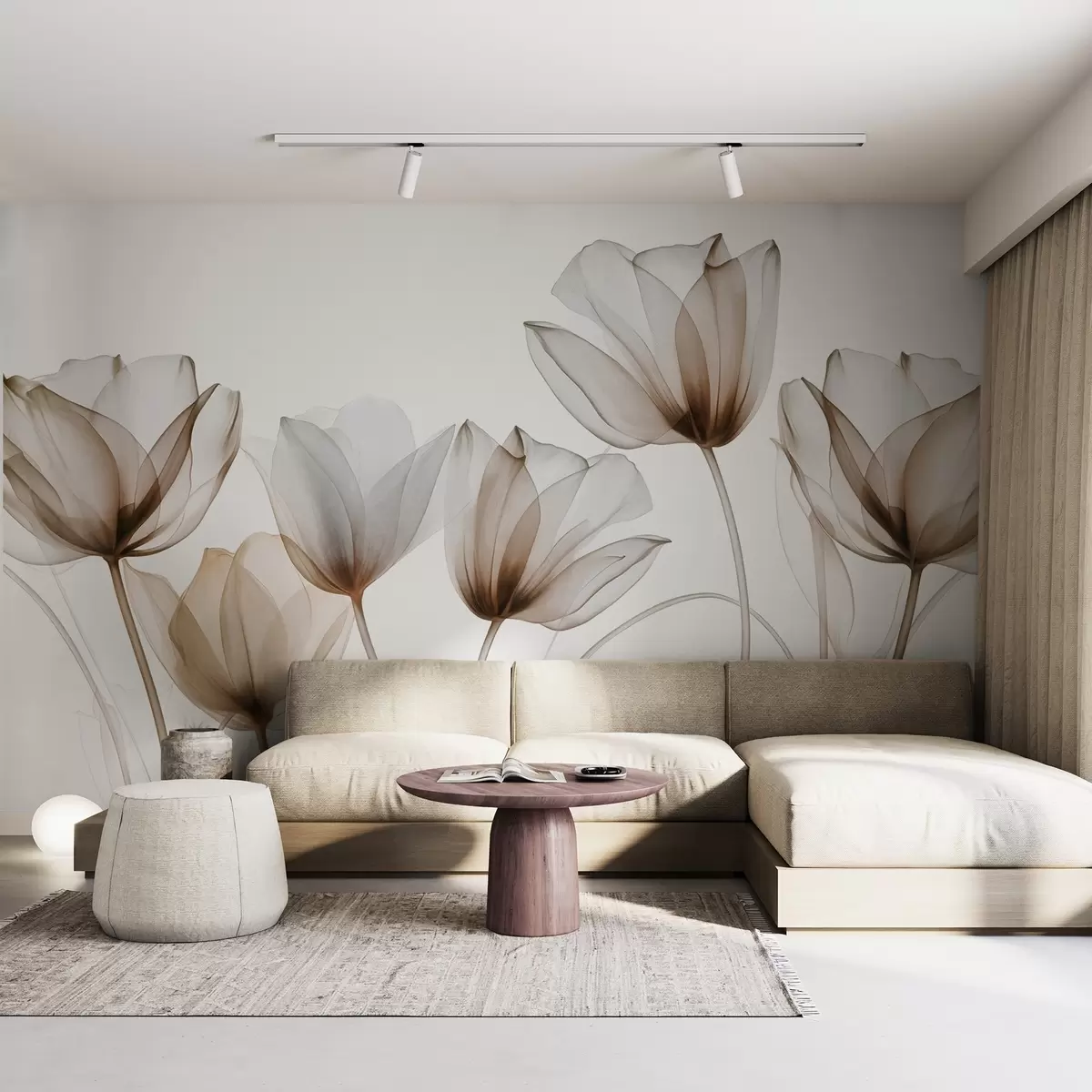 Fototapetak Átlátszó barna és fehér tulipánvirágok hosszú szárakkal, világos háttér előtt, finom és texturált virágművészet Nr. w09538v1