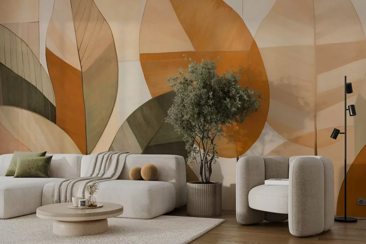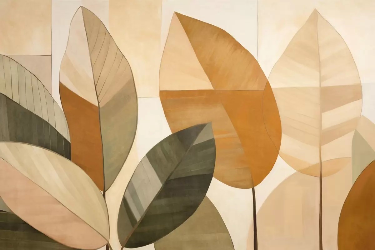 Fototapetak Absztrakt, narancssárga, barna és zöld árnyalatú, texturált, nagy levelek világos háttér előtt elrendezve Nr. w09539