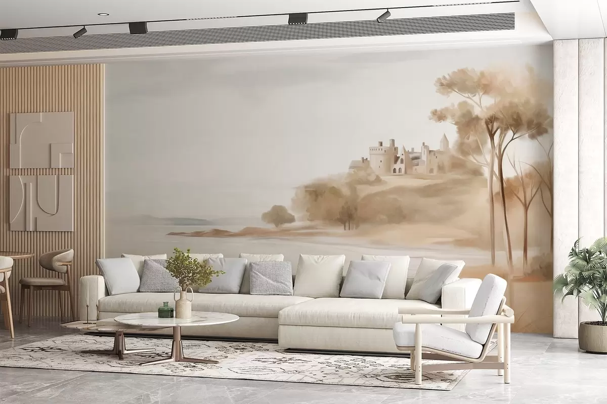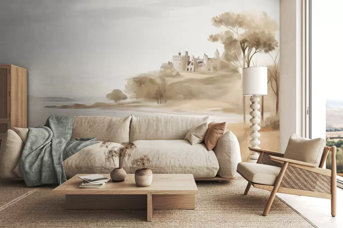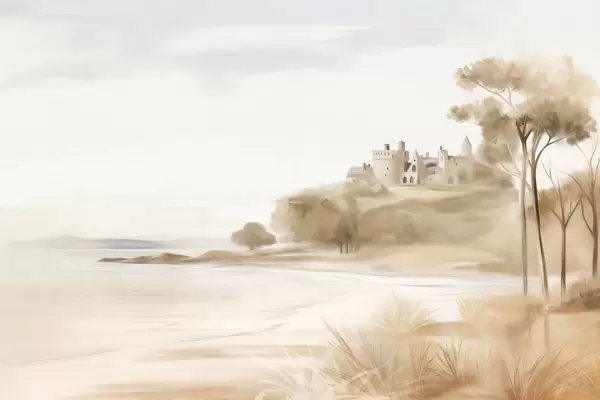 Fototapetak Tájkép egy kastéllyal a tengerparti dombon, homokos strand az előtérben, tompított színek, texturált művészet Nr. w09540