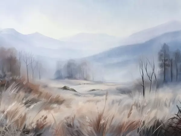 Fototapetak Texturált táj, előtérben száraz fűvel, háttérben fákkal, távolban hegyekkel Nr. w09542
