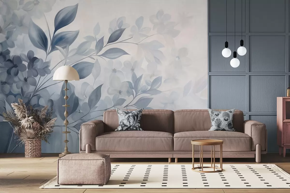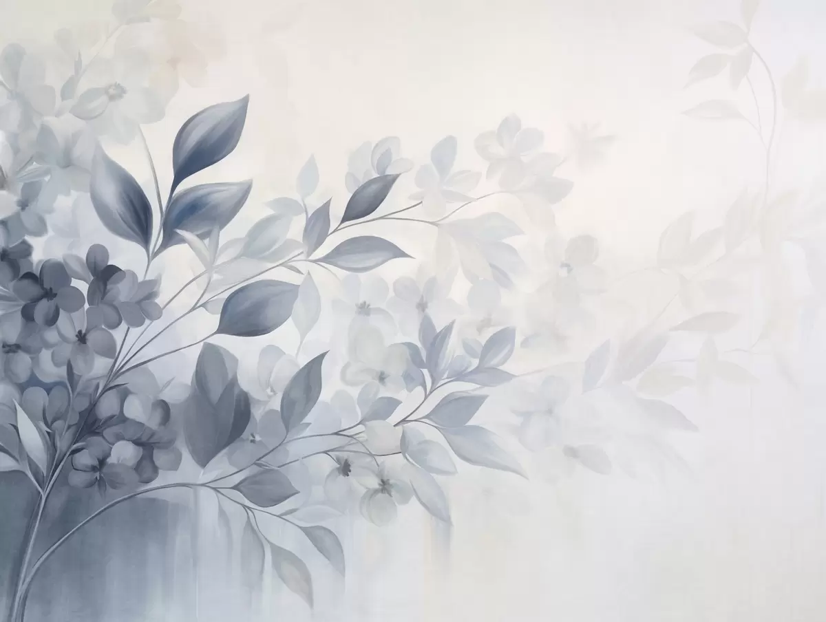 Fototapetak Texturált kék és fehér ág virágokkal és levelekkel, amelyek halvány háttérrel elmosódnak, akvarell festmény stílusban. Nr. w09543