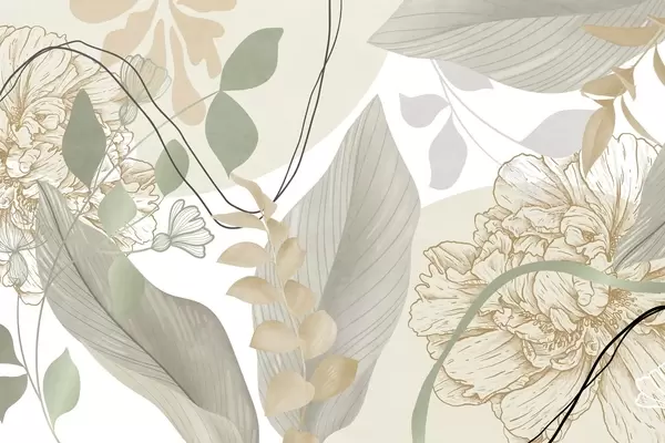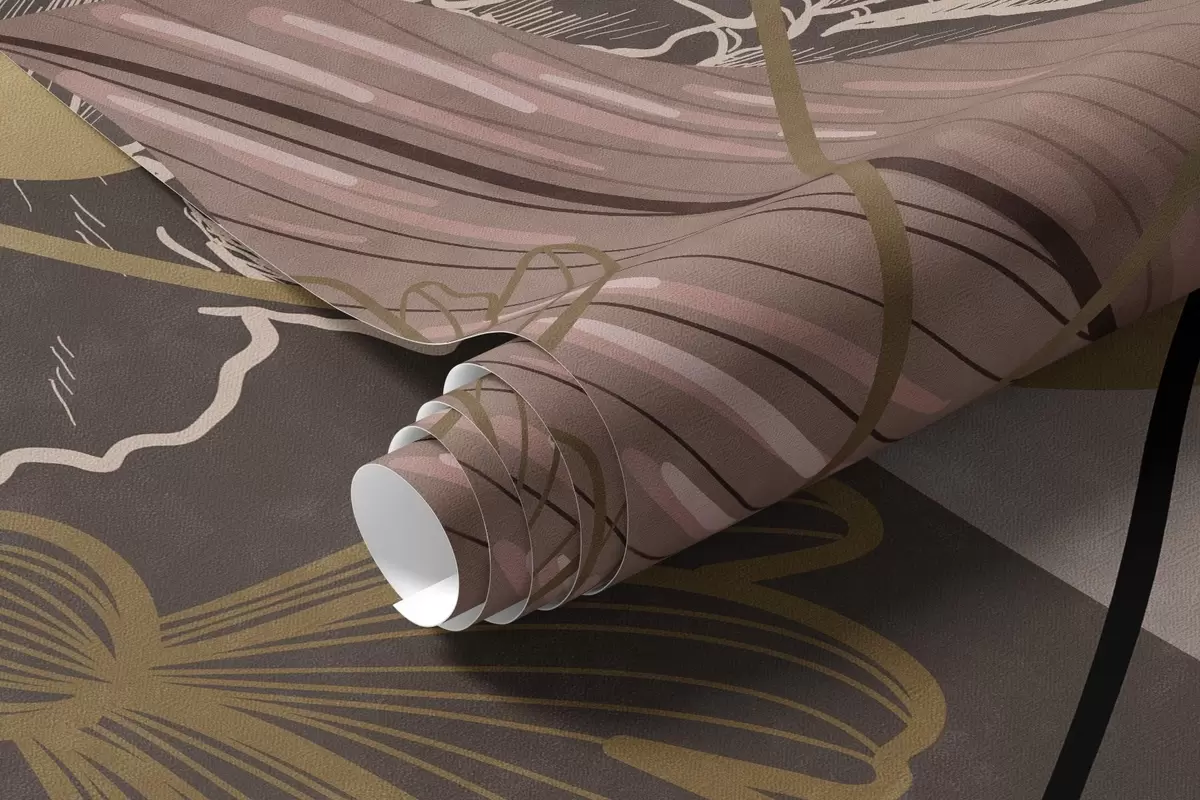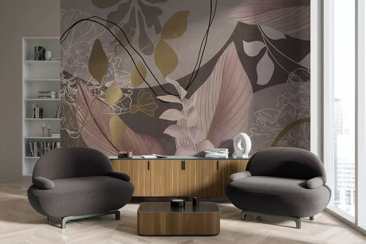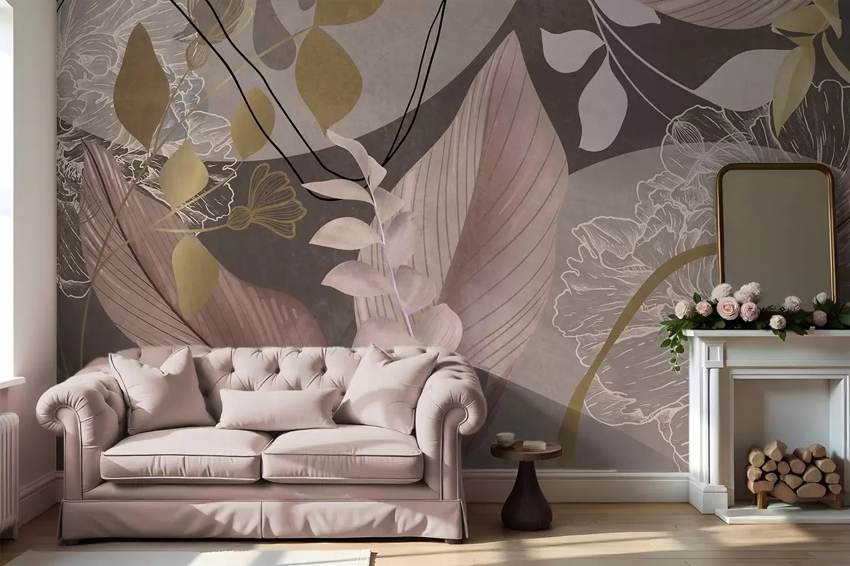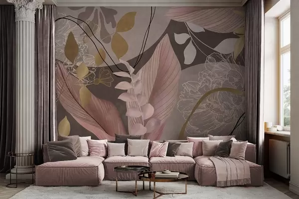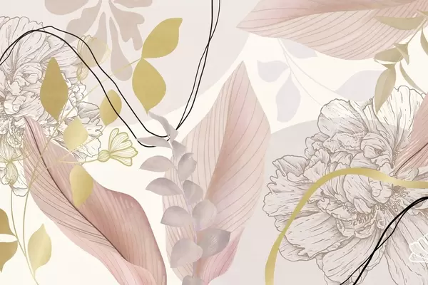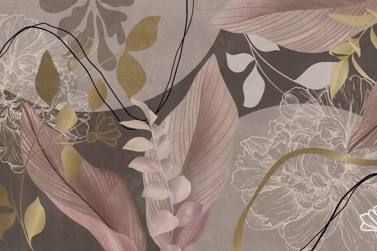 Fototapetak Absztrakt virágmintás nyomtatás, nagy levelekkel, halvány rózsaszín és barna árnyalatokban, vékony fekete vonalakkal és fehér virágkontúrokkal. Nr. w09544