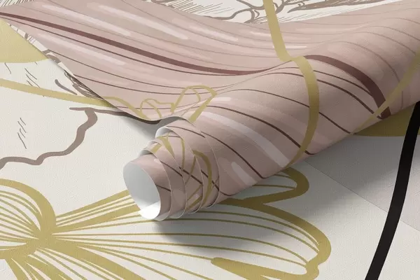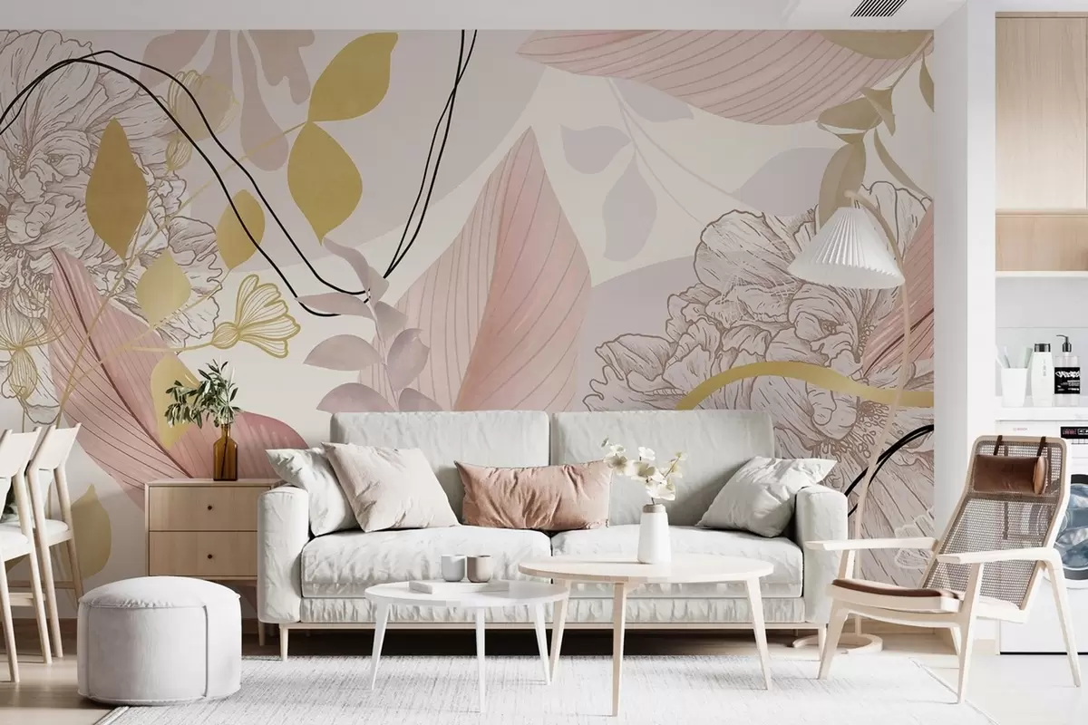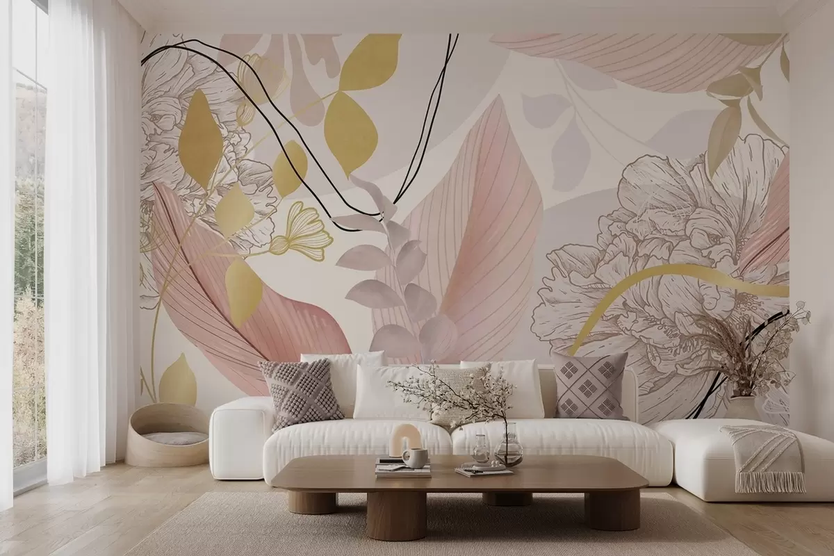 Fototapetak Absztrakt virágmintás nyomtatás, nagy levelekkel, halvány rózsaszín és sárga árnyalatokban, vékony fekete vonalakkal és fehér virágkontúrokkal. Nr. w09544v1