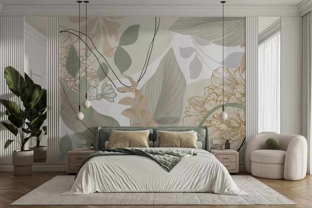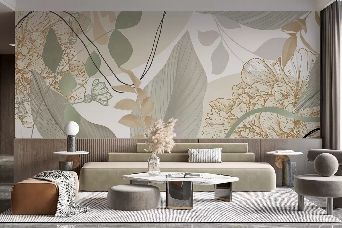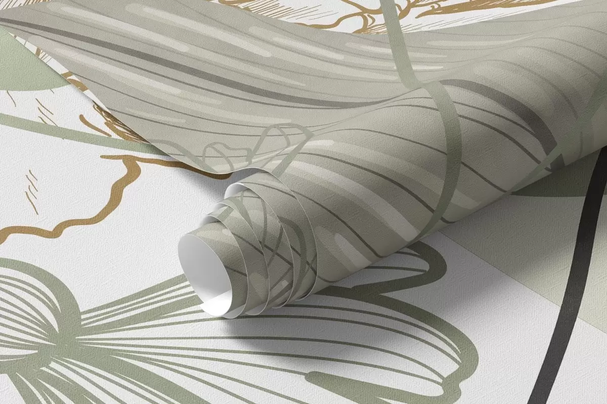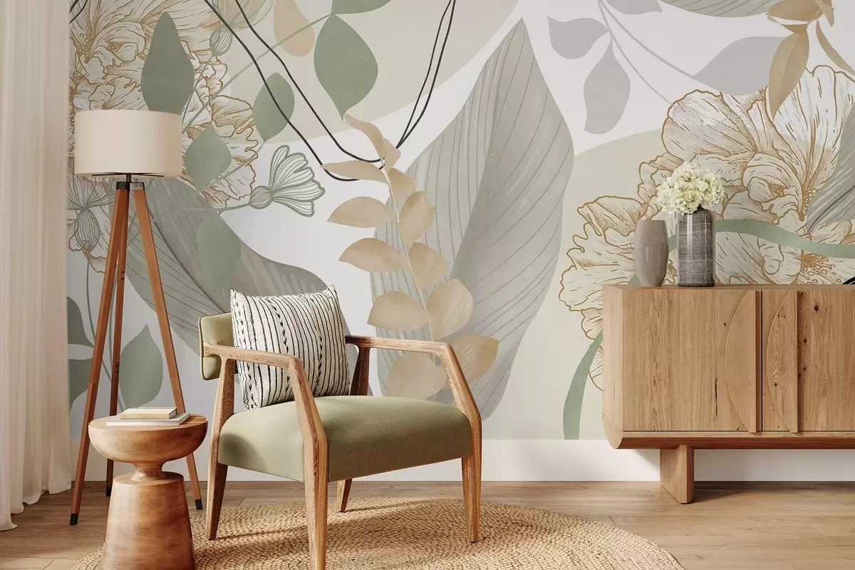 Fototapetak Absztrakt virágmintás nyomtatás, nagy levelekkel, tompa zöld és sárga árnyalatokban, vékony fekete vonalakkal és fehér virágkontúrokkal. Nr. w09544v2