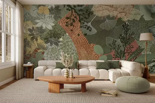 Fototapetak Absztrakt textúrájú kollázs botanikai elemekből, levelekkel, virágokkal és organikus textúrákkal, zöld és barna árnyalatokban Nr. w09545