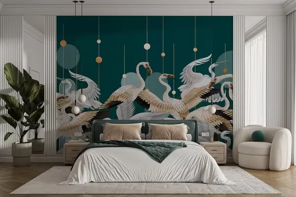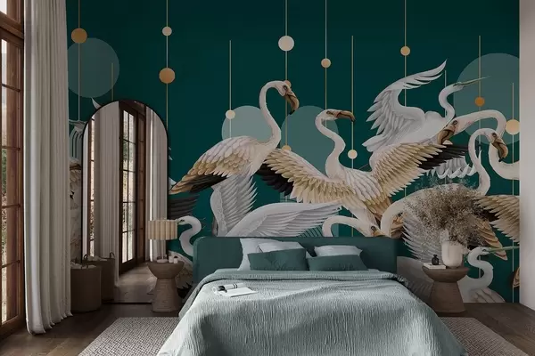 Fototapetak Finom szárnyú fehér flamingók serege, sötétzöld háttér előtt, sárga vonalakkal és körökkel Nr. w09546