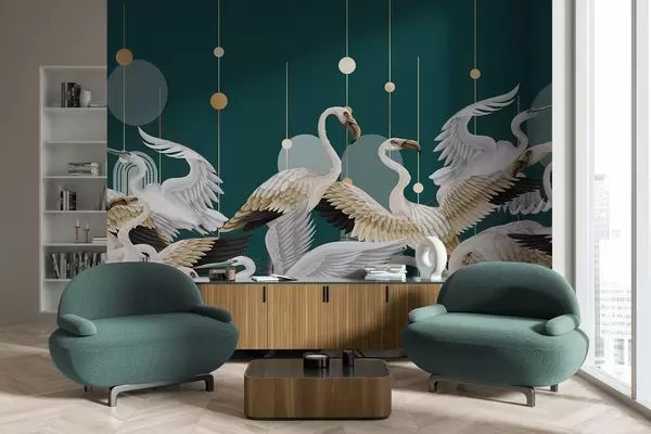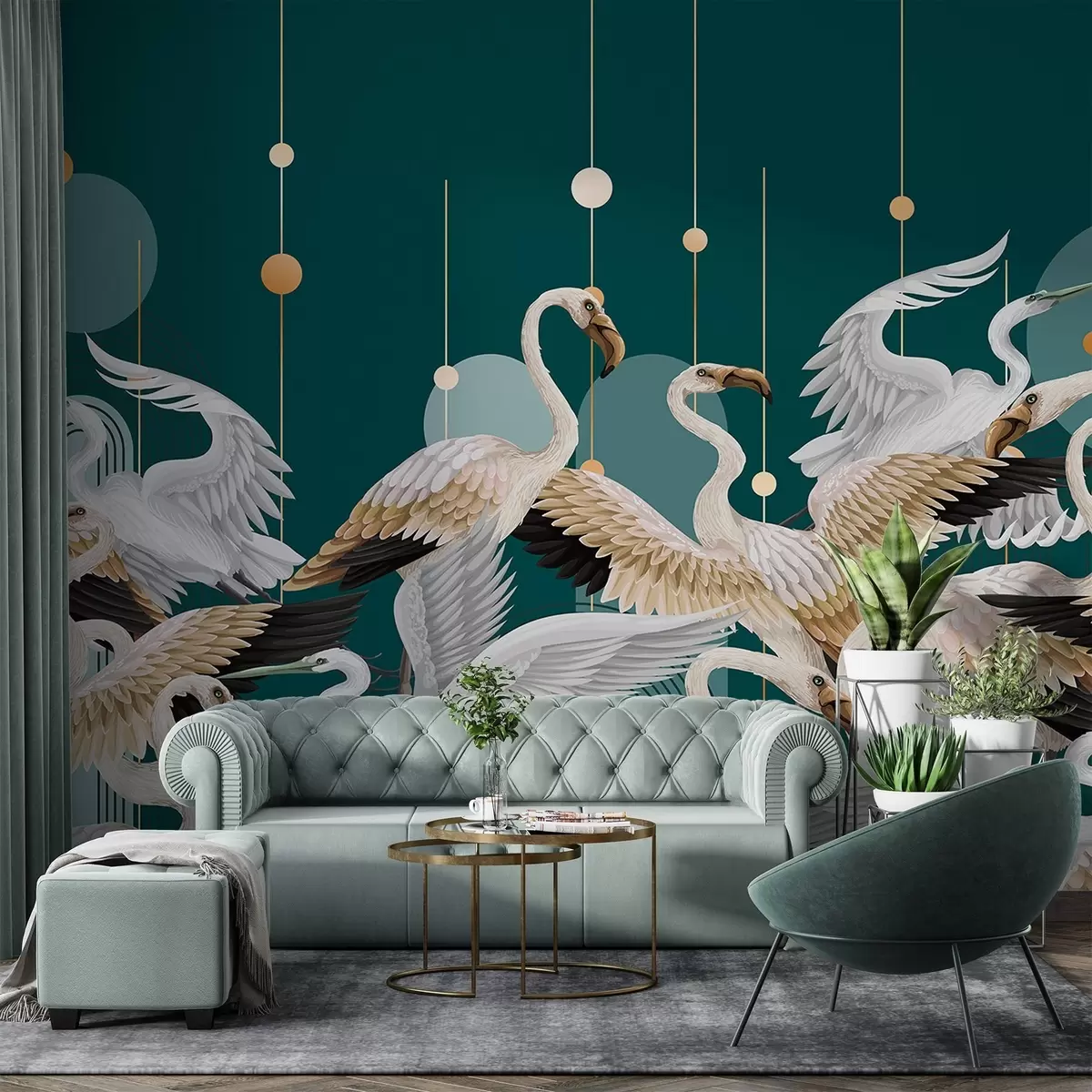 Fototapetak Finom szárnyú fehér flamingók serege, sötétzöld háttér előtt, sárga vonalakkal és körökkel Nr. w09546
