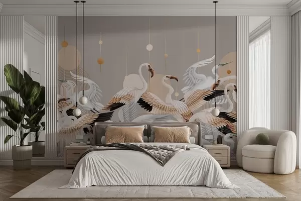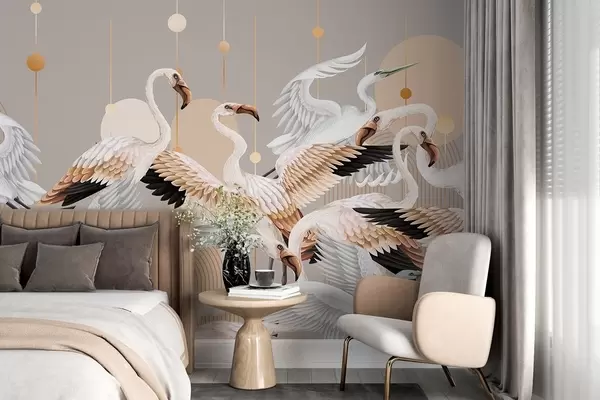 Fototapetak Finom szárnyú fehér flamingók raj, semleges háttér előtt, sárga vonalakkal és körökkel Nr. w09546v1