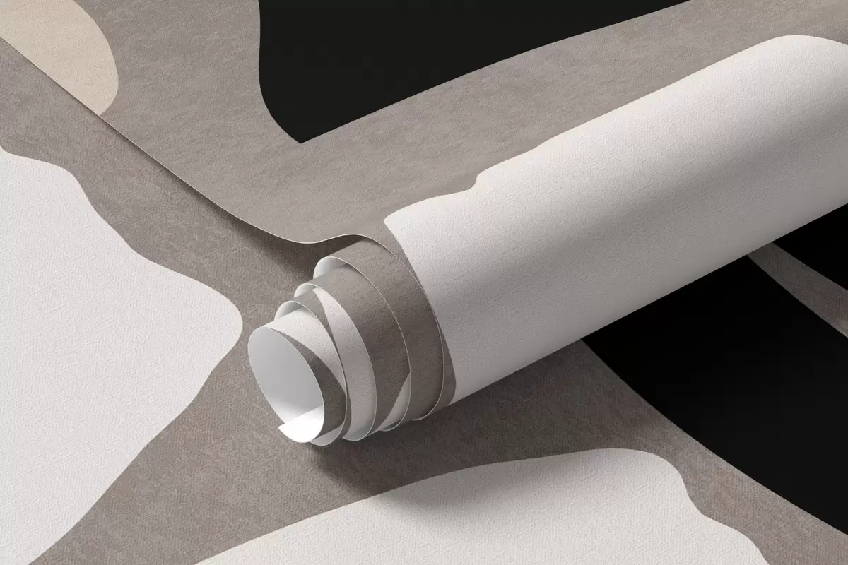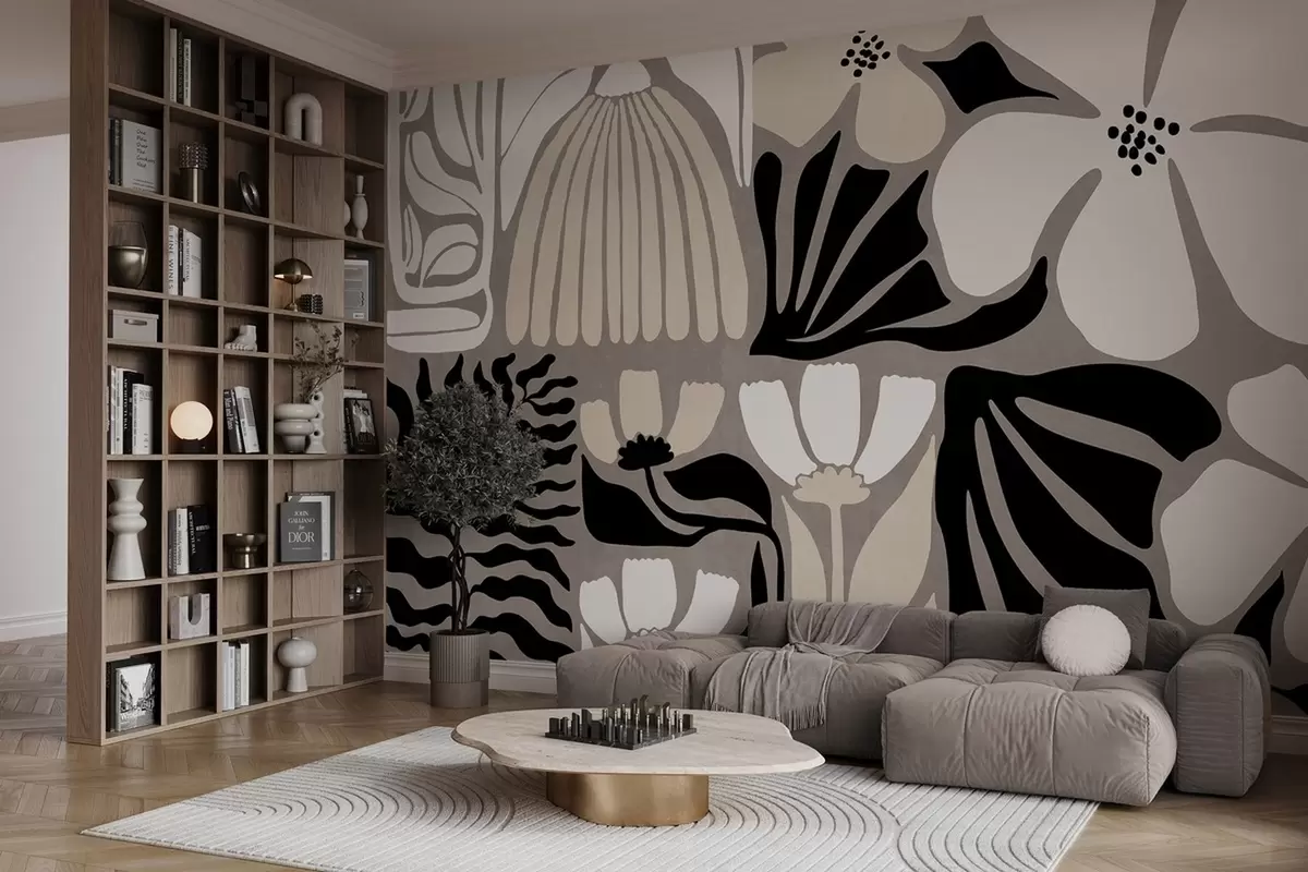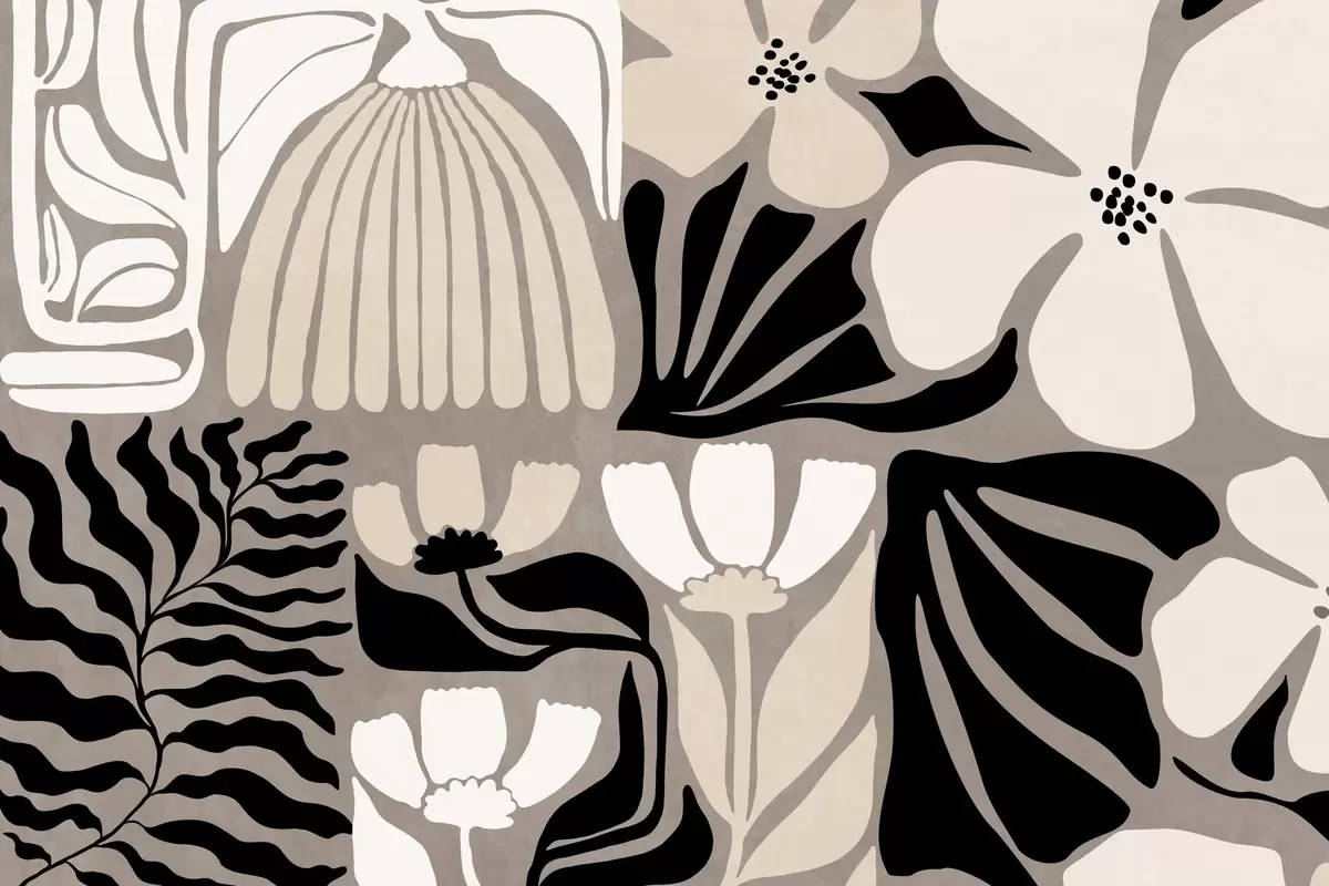 Fototapetak Modern, minimalista stílusú virágok és levelek bézs, fekete és fehér színben, szürke háttérrel Nr. w09547