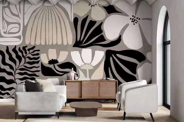 Fototapetak Modern, minimalista stílusú virágok és levelek bézs, fekete és fehér színben, szürke háttérrel Nr. w09547
