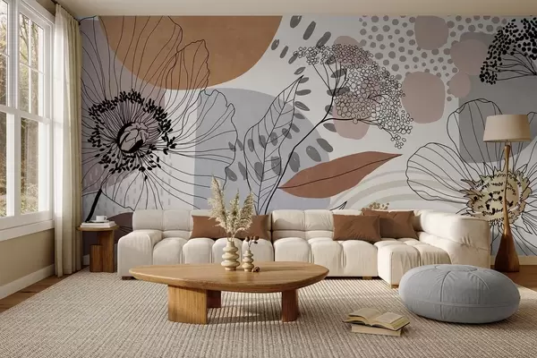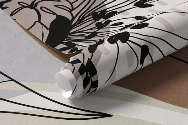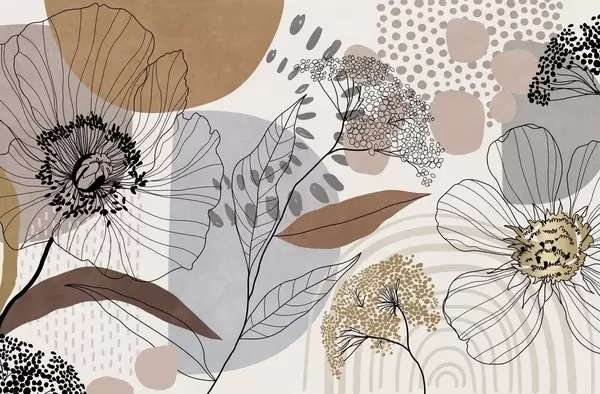Fototapetak Absztrakt virágmintás textúrájú nyomtatás, vonalas rajzokkal, levelekkel és organikus formákkal, tompított barna, bézs és szürke árnyalatokban. Nr. w09548