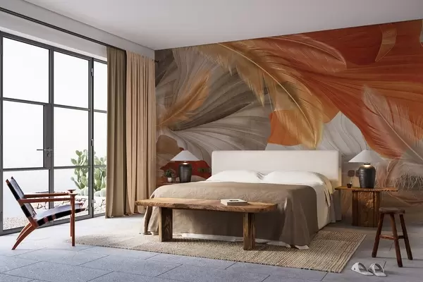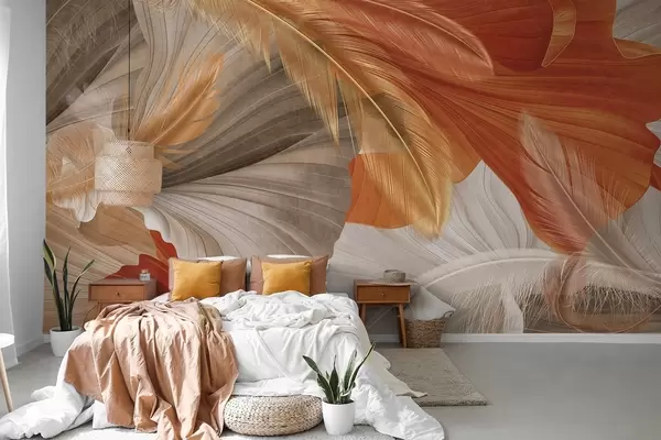 Fototapetak Absztrakt textúrájú, nagy, áramló formák krém és rozsda színekben, finom, sárga, bézs és barna tollakkal Nr. w09549