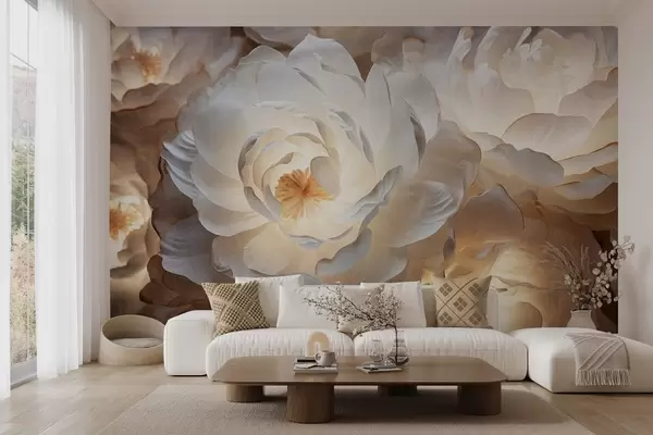 Fototapetak Nagy, fehér, fantázia pünkösdi rózsa virágok sárga közepekkel, lágy megvilágítással és finom, texturált, réteges szirmokkal Nr. w09550