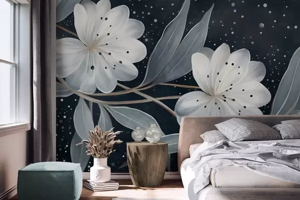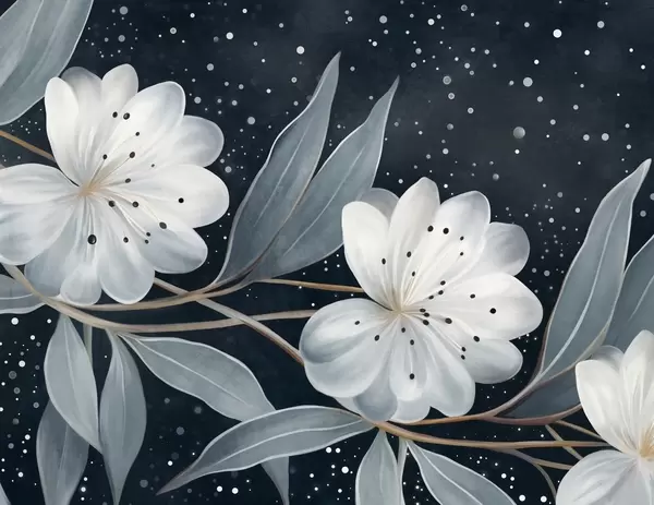 Fototapetak Fantasztikus textúrájú fehér virágok, kékes-zöld levelekkel és ágakkal körülvéve, sötét háttér előtt Nr. w09551