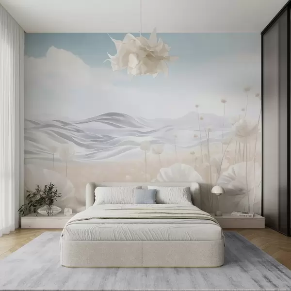 Fototapetak Texturált, krémes pipacsokkal borított mező, hullámzó dombok, halványkék ég, puha felhők, pasztell színek Nr. w09553