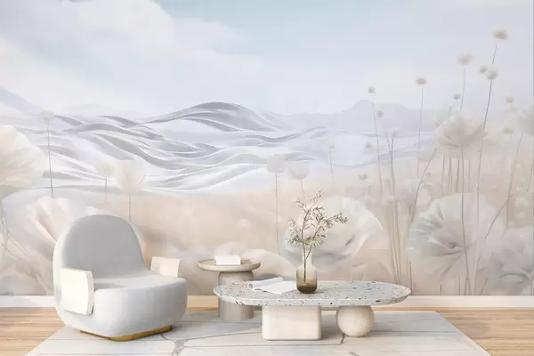 Fototapetak Texturált, krémes pipacsokkal borított mező, hullámzó dombok, halványkék ég, puha felhők, pasztell színek Nr. w09553