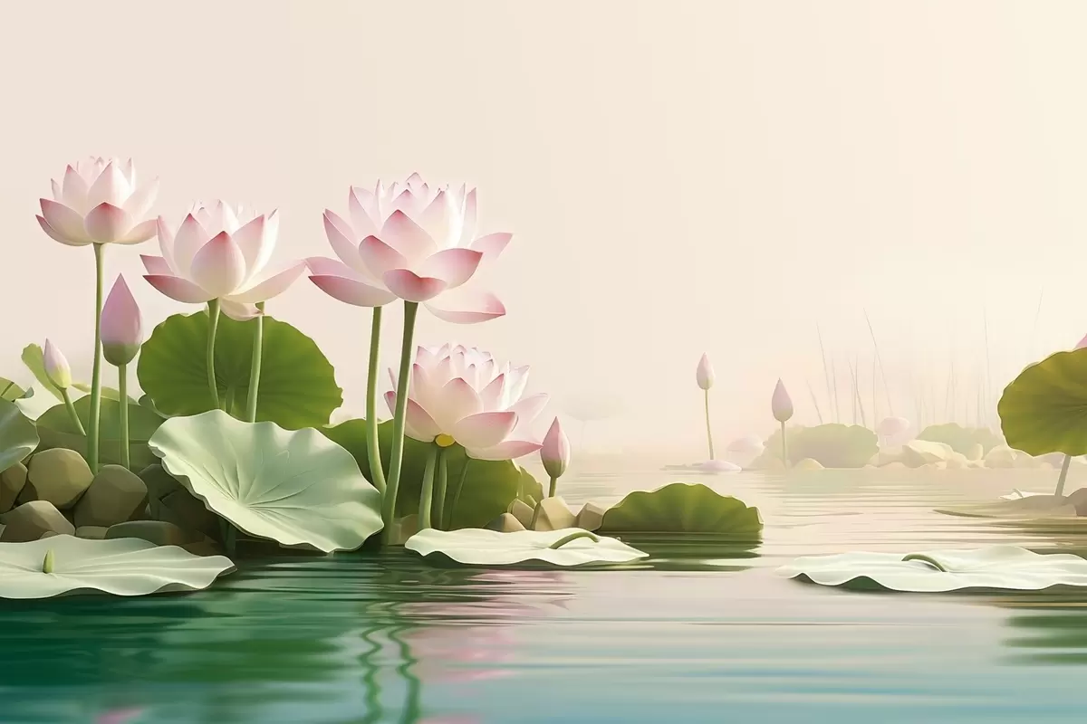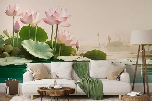 Fototapetak Rózsaszín lótuszvirágok a vízen, nyugodt trópusi táj Nr. w09561