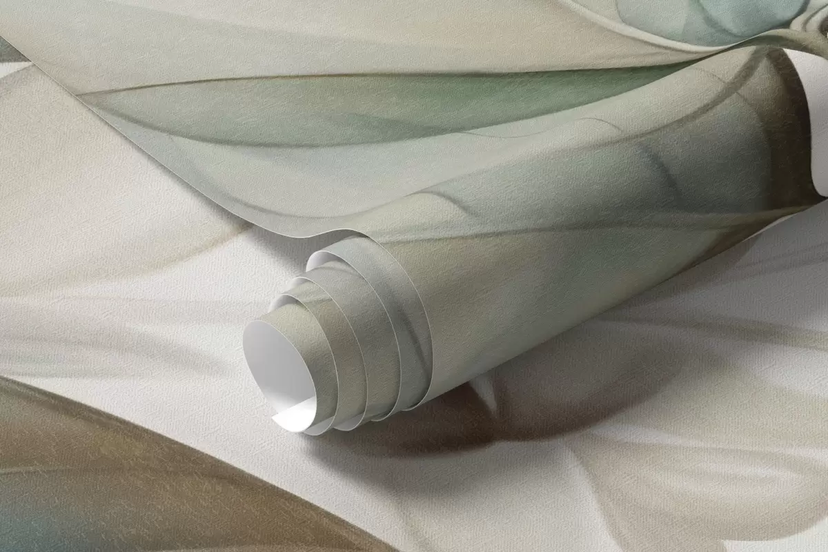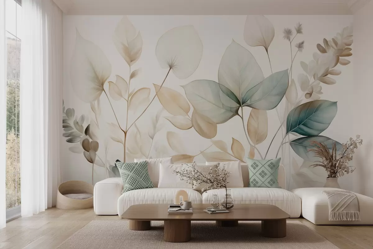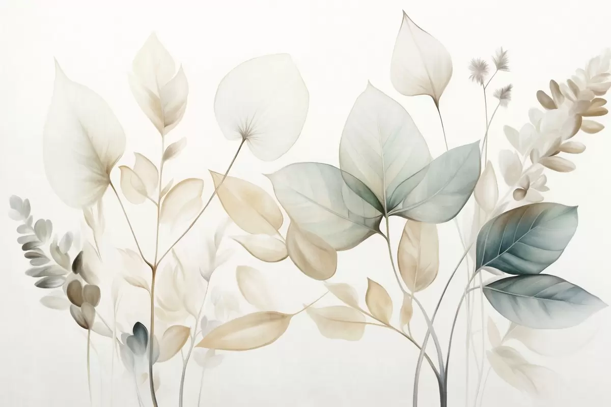 Fototapetak Texturált, áttetsző levelek halvány bézs és türkiz árnyalatokban, finom szárakkal, puha, világos háttér előtt. Nr. w09583
