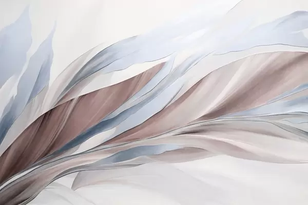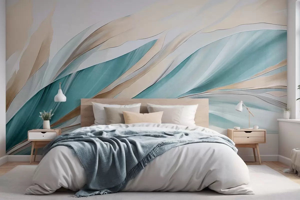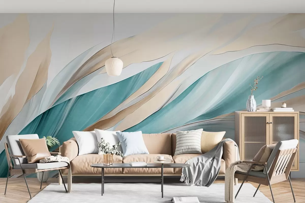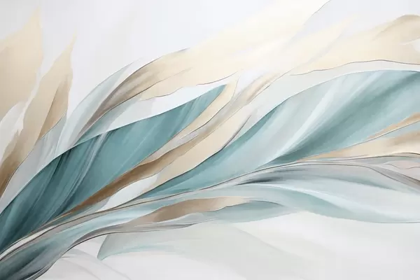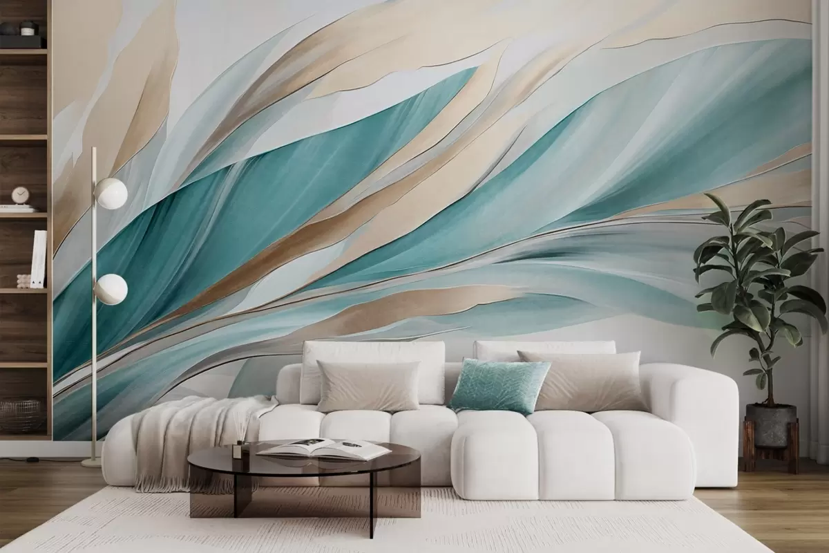 Fototapetak Absztrakt, áramló hullámok türkiz és sárga színben, vékony formákkal és vonalakkal, fehér háttér előtt, texturált művészet Nr. w09585