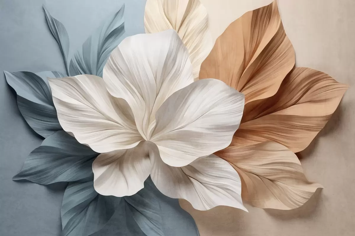 Fototapetak Absztrakt, többszirmú virág texturált levelekkel, barack és kék árnyalatokban, puha háttérrel Nr. w09604