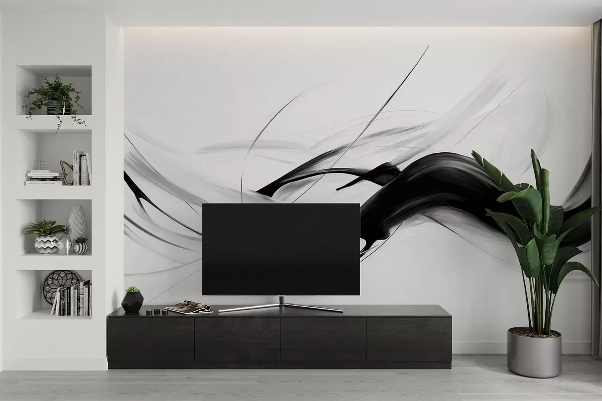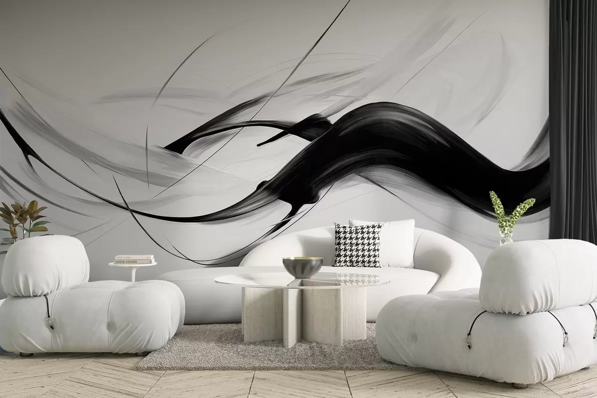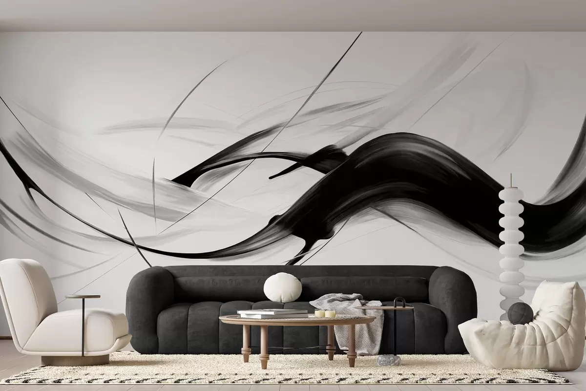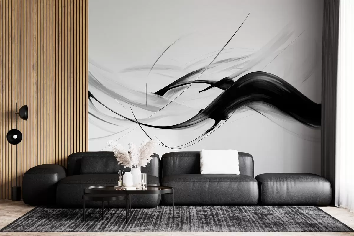 Fototapetak Absztrakt fekete-fehér ecsetvonások vékony vonalakkal, amelyek világos háttér előtt modern dizájnt alkotnak. Nr. w09605