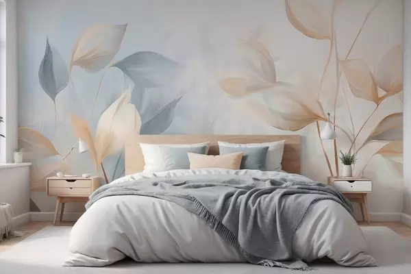 Fototapetak Puha, finom, áttetsző levelek halvány bézs, barack és halványkék árnyalatokban, texturált pasztell művészet Nr. w09607