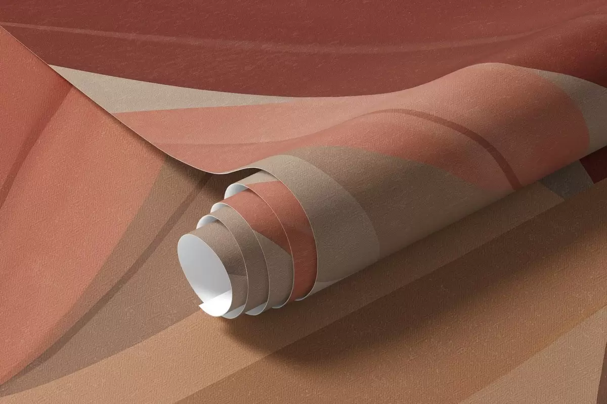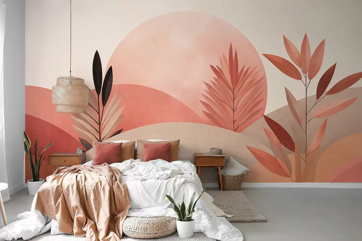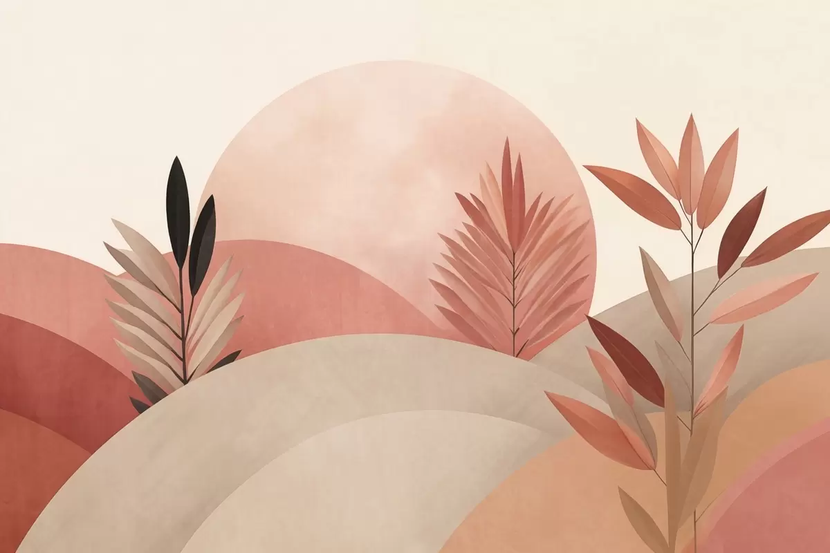 Fototapetak Absztrakt boho tájkép, nap a dombok mögött, növények az előtérben, minimalista, texturált, tompított színek Nr. w09608