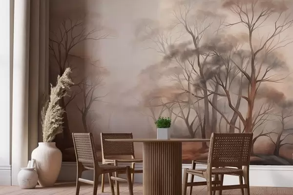Fototapetak Texturált fák ködös erdőben, ködös táj, tompított színekkel és lágy megvilágítással Nr. w09609