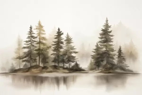 Fototapetak Texturált, ködös erdő magas fenyőfákkal, festmény utánzat Nr. w09610