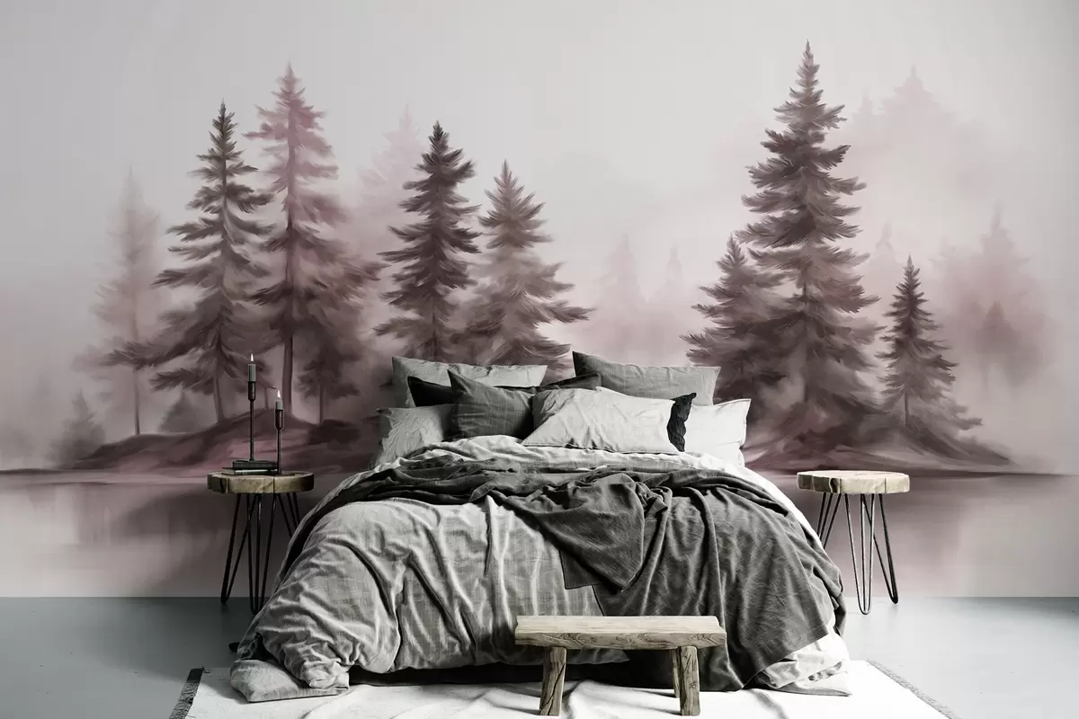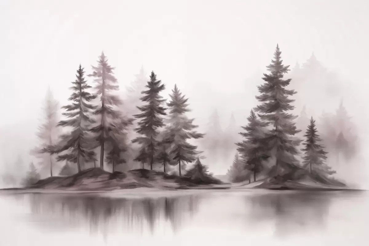 Fototapetak Texturált, ködös erdő magas fenyőfákkal, festmény utánzat Nr. w09610v1