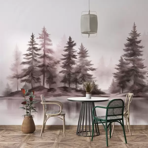 Fototapetak Texturált, ködös erdő magas fenyőfákkal, festmény utánzat Nr. w09610v1