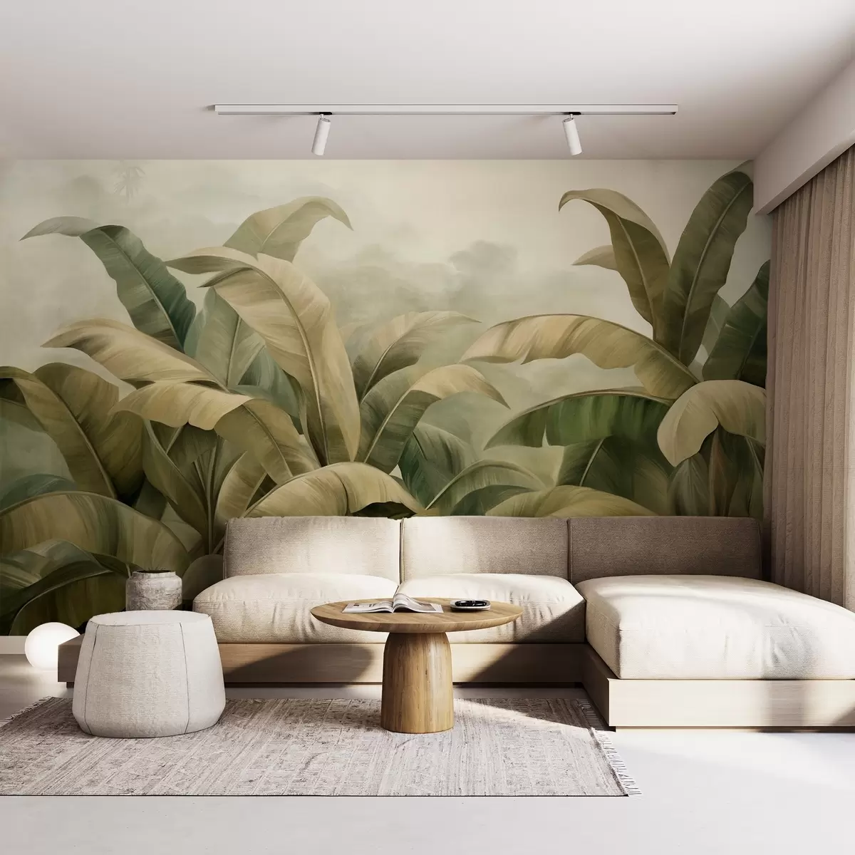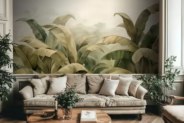 Fototapetak Texturált, sűrű dzsungel táj, nagy banánlevelekkel, tompa zöld és bézs árnyalatokban Nr. w09613
