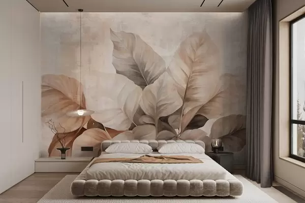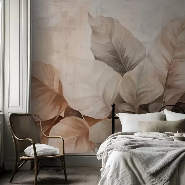 Fototapetak Texturált festmény, amely nagy, világosbarna leveleket ábrázol semleges háttér előtt, finom ecsetvonásokkal. Nr. w09614