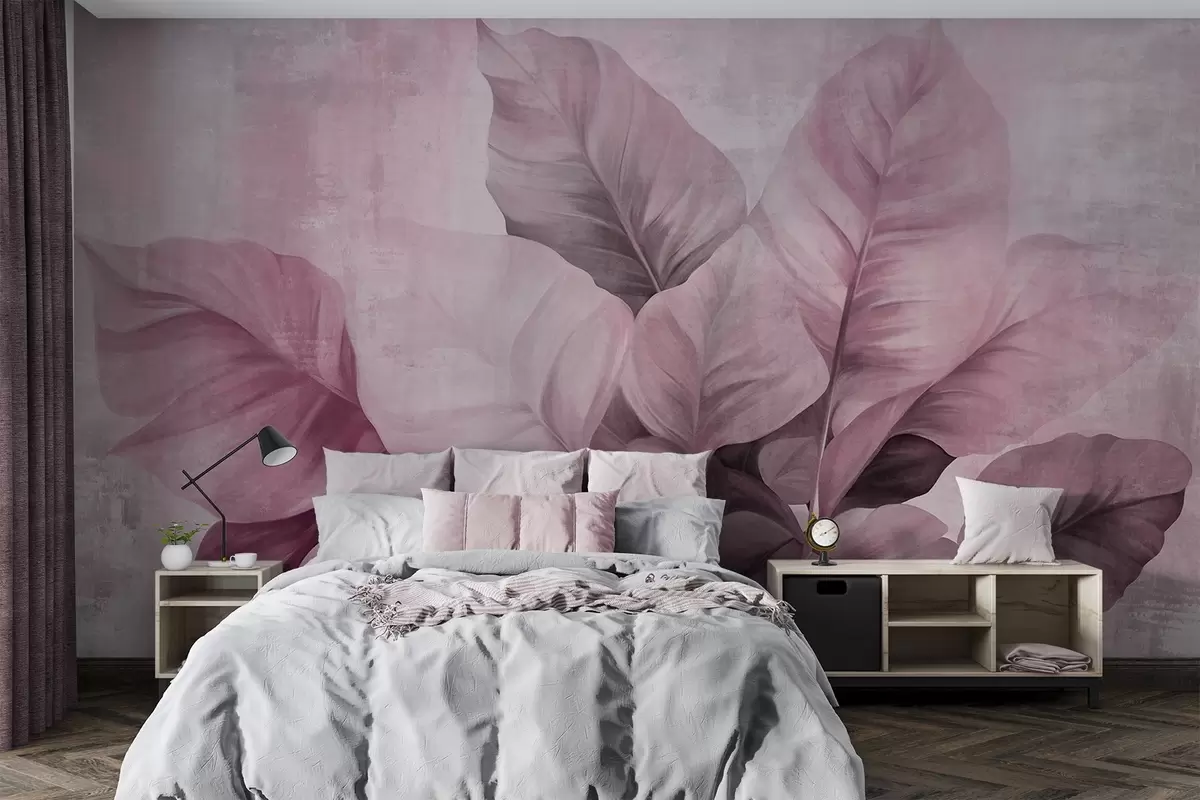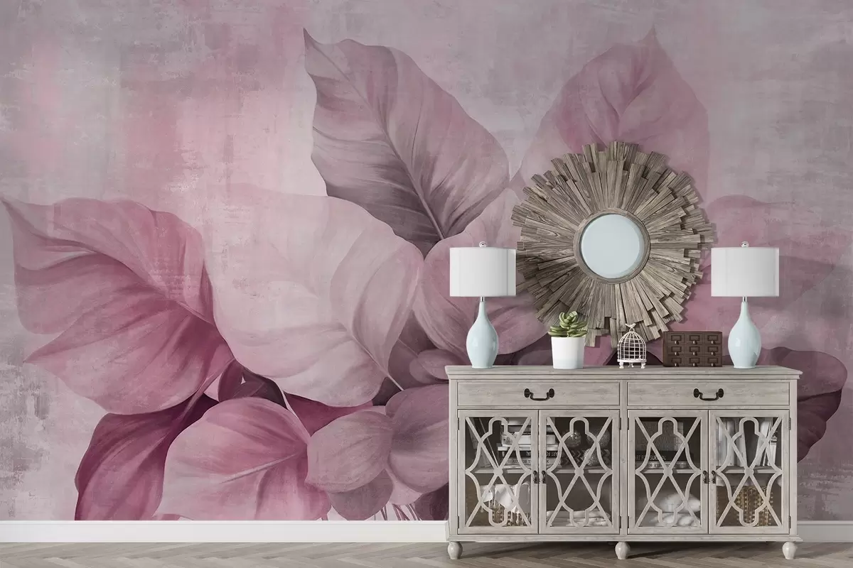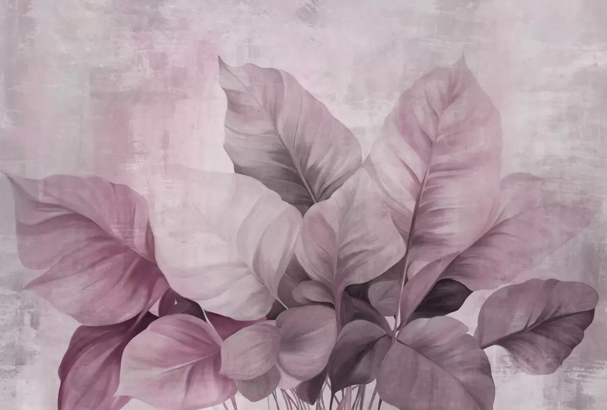 Fototapetak Texturált festmény, amely nagy, világos rózsaszín leveleket ábrázol semleges háttér előtt, finom ecsetvonásokkal. Nr. w09614v1