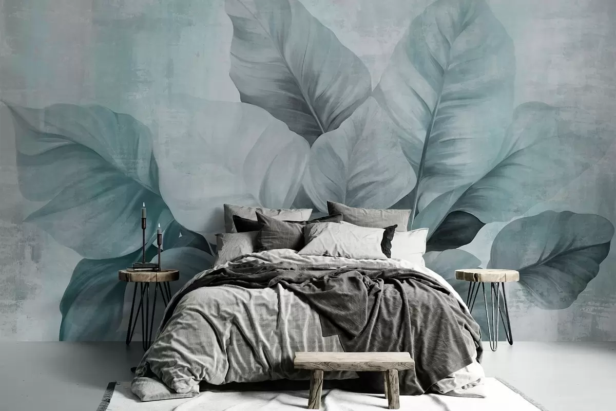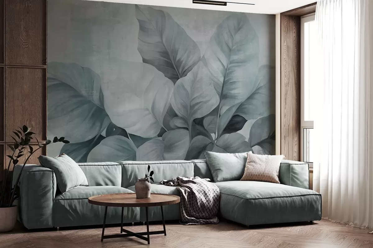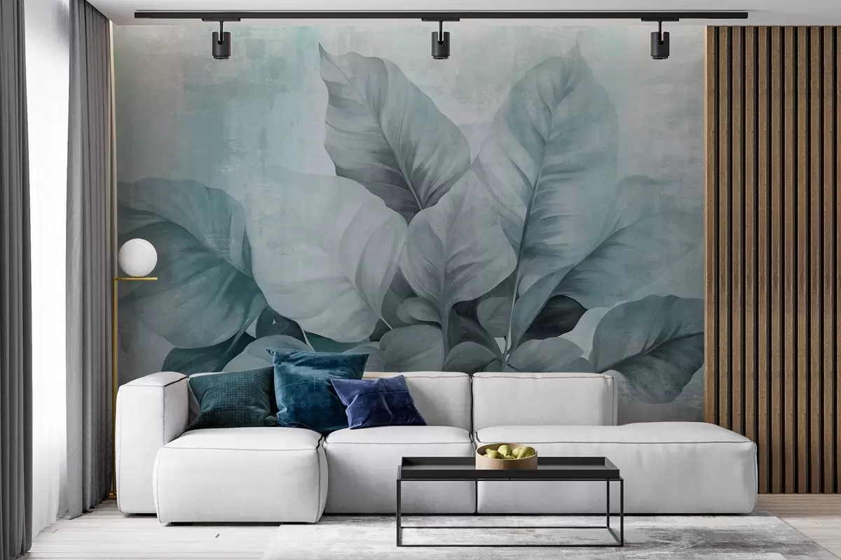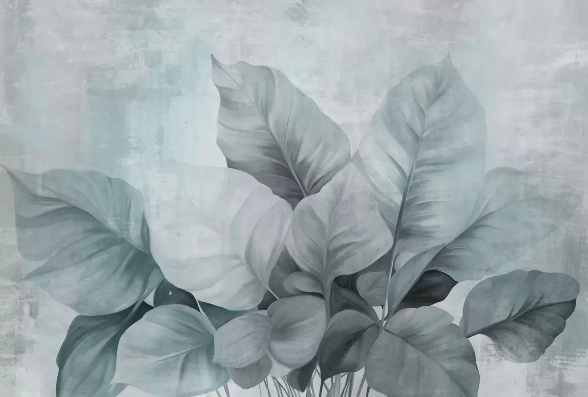 Fototapetak Texturált festmény, amely nagy, világoskék leveleket ábrázol semleges háttér előtt, finom ecsetvonásokkal. Nr. w09614v2