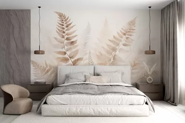 Fototapetak Texturált, szárított páfránylevelek különböző barna árnyalatokban, puha, világos háttérrel, akvarell stílusban. Nr. w09615